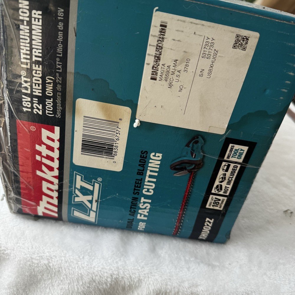 Has some dirt on the box from sitting in garage.. hasn’t been opened. When shipping I will just put the label on the product box. The Makita 18V LXT Lithium-Ion Cordless Hedge Trimmer (XHU02Z) is a high-quality tool perfect for maintaining your yard and garden. With a powerful 18V battery and cordless design, this hedge trimmer provides efficient cutting with its 22-inch blade length. The ergonomic design, along with the included accessories like a guide bar cover and user manual, ensure a comfortable and easy trimming experience. Makita is a trusted brand known for producing reliable outdoor power equipment, making this hedge trimmer a durable and efficient addition to your outdoor tools.
