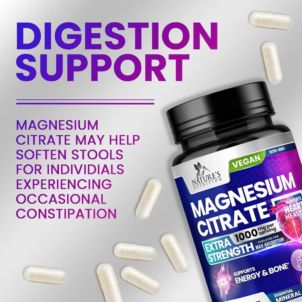 EXTRA STRENGTH FORMULA: Each capsule of Nature's Nutrition Magnesium Citrate delivers 1000 mg of chelated magnesium for maximum absorption; Experience the best magnesium citrate for full benefits with our magnesium supplement SUPPORTS MUSCLE HEALTH: Our magnesium pills help support muscle health, cramps, and support relaxation after workouts; This magnesium supplement for women and men provides essential muscle support NERVE AND BONE SUPPORT: Magnesium supports nerve health and bone strength; Our magnesium vitamin pills ensure you get vital support for nerve and bone health PURE AND NATURAL: Our non-GMO capsules, known as citrate de magnesio or magnesio, are free from artificial additives, offering a natural magnesium source; Trust Nature's Nutrition for purity in every magnesium supplement MAGNESIUM CITRATE SUPPLEMENT: best bone vitamin pills capsule capsules citrato complex d d3 extra glycinate gummies health heart nerve support mag magnes magnesio magnesiu malate men mg calm muscle natural nature natures nutrition nutrition glycinate oxide powder softgels strength supplements tablets threonate vegan 1000 1000mg 110 200 250 400 400mg 500 500mg vitamins women
