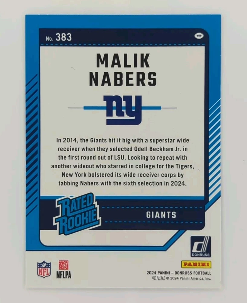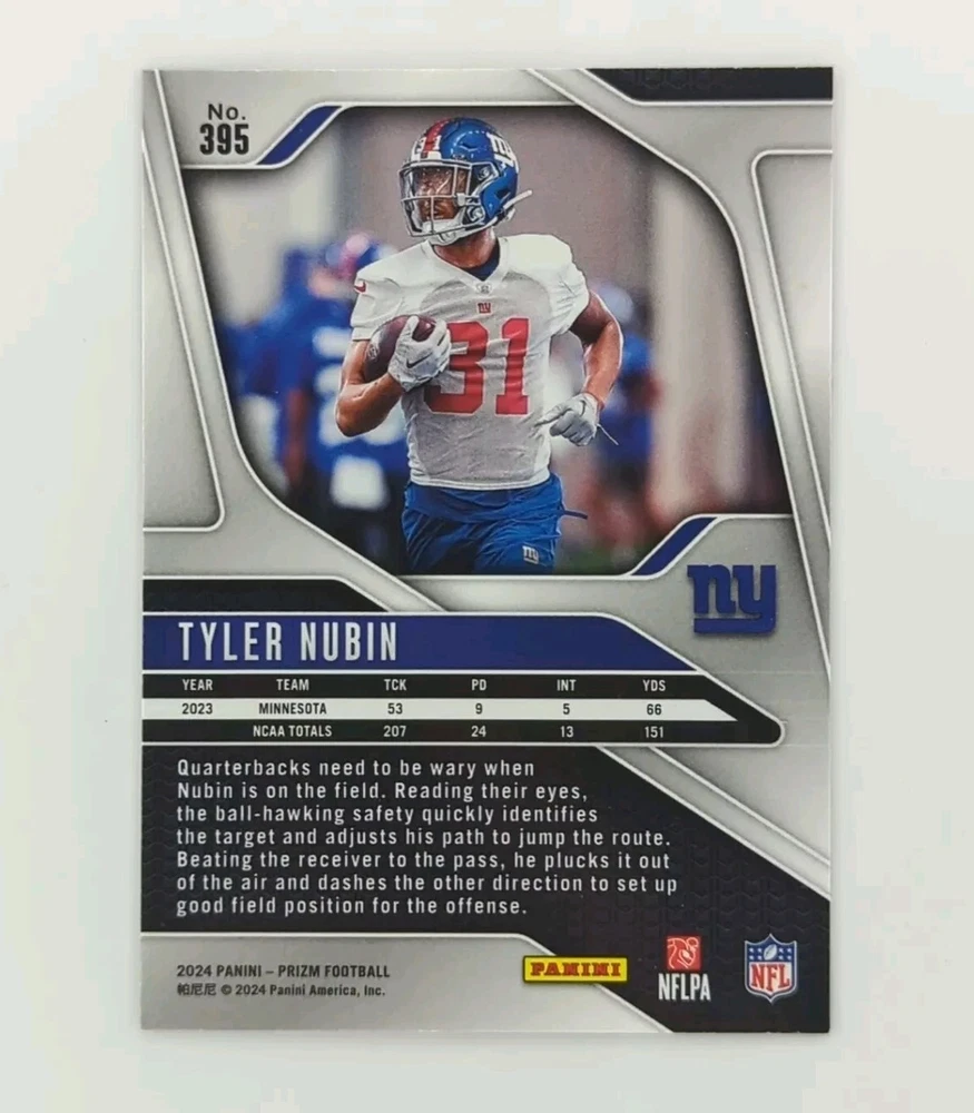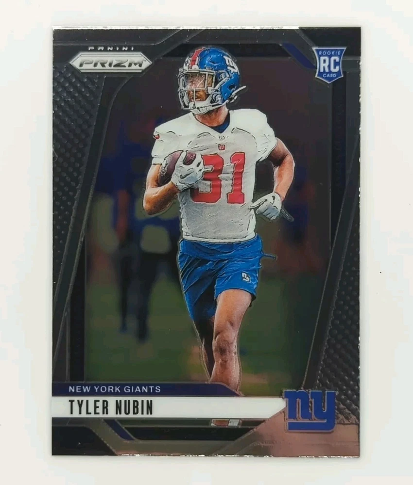 The product is a lot of two 2024 football trading cards featuring rookies Malik Nabers and Tyler Nubin. Both cards are from the Panini brand, specifically from the 2024 Panini Prizm Football and 2024 Donruss Football sets. These cards are part of the Base Set and Rookie categories, showcasing these players during their debut season with the New York Giants in 2024. As these are rookie cards, they hold significant value for collectors and fans looking to add these promising athletes to their card collections.