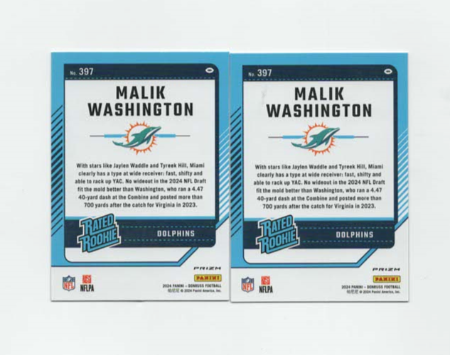 You are bidding on one LOT OF (2) MALIK WASHINGTON 2024 DONRUSS RATED ROOKIE RED PANDORA OPTIC PRIZM ROOKIE CARDS #397. Shipping & Handling in the US is $4.50 MAILED IN A PADDED ENVELOPE WITH TRACKING/DELIVERY CONFIRMATION . Please add .50 cents per extra auction won. Check my other auctions for new released cards from your favorite teams or players. Thank you.
