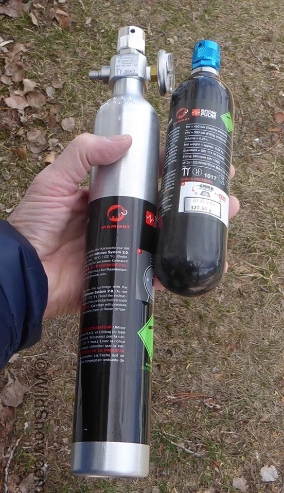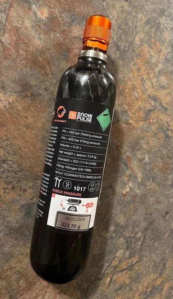 Selling Mammut Carbon Airbag cartridge.. Works with Mammut Airbag systems. These are single-use.. but super light (310g) and way smaller than the standard re-fillable canisters (see attached image from wildsnow) -must ship usps ground advantage due to TSA carrier restrictions
