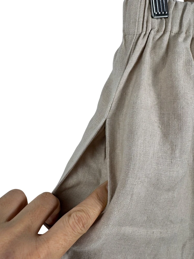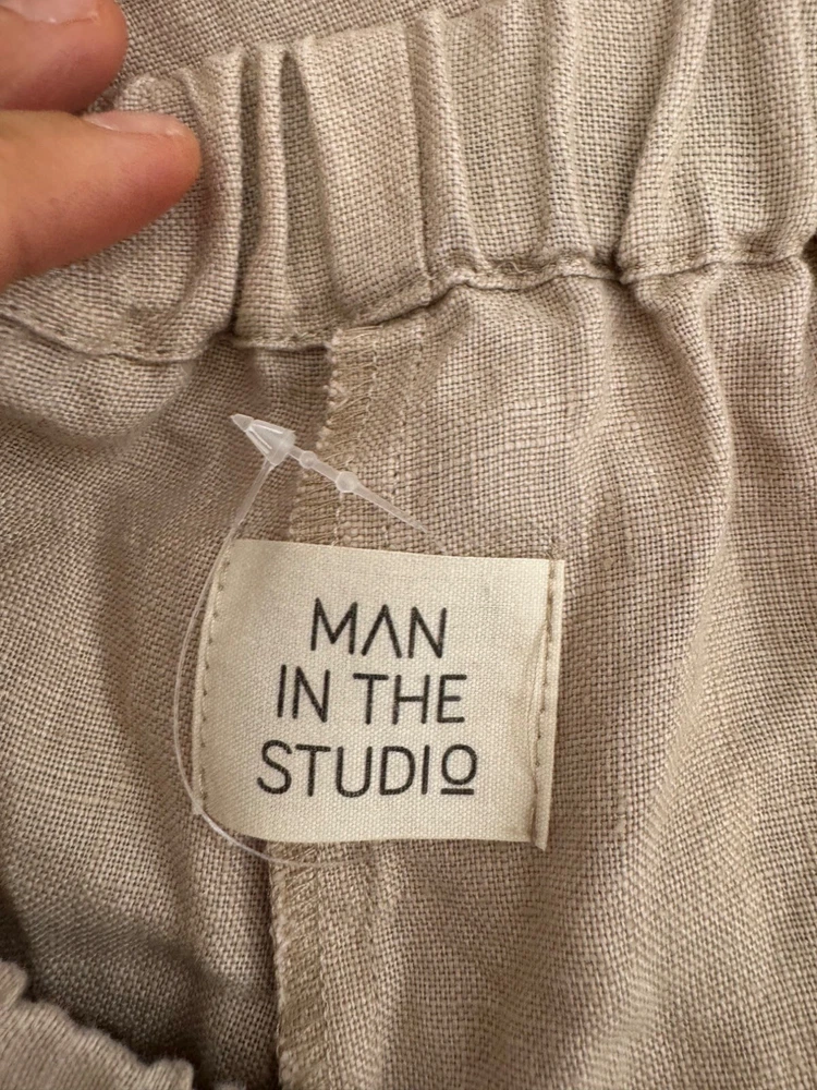 Excellent condition / inseam had been hemmed for petite length The essence of Man in the Studio is a clothing line that we create for the dolce far niente lifestyle – the sweet feeling of doing nothing. Living in the now, observing the landscapes or the buzz of life around you, enjoying time going by, immersing with creativity. All those are the moments that our clothes reveal at their best. We produce our clothes only by made-to-order principles, and have designed them to be timeless, staple pieces to withstand trends and encourage slower consumption habits. pockets on each sides SIZE M *BODY: Bust: fits bust around 36”-38”/ 92-96 cm Waist: fits waist around 28”-30”/ 72-76 cm Hips: fits hips around 37”-38”/ 94-98 cm 100% Midweight Linen Flat lay: waist 14" (elastic waist which stretches) Rise 13" Inseam 27.5" Leg Opening 14.5" Material: missing but obviously linen linen, boho, wide leg, coastal, minimalist, designer, 90s, flowy, relaxed, loose fit, preppy, money, high quality, sophisticated, timeless, effortless, versatile PLEASE check all flat lay measurements and listings carefully BEFORE PURCHASE!I put in a lot of work into hand measuring and researching each items as best as I can! Thank you so much for your consideration! Please note that: RETURN SHIP FEE IS PAID BY THE BUYER! If you are not too familiar with flat lay measurements, I recommend taking a measurement of your own clothes that you feel comfortable and compare with the measurement I provide. For returns: The items MUST BE IN SAME CONDITION AS SOLD for full refund! We all don't like returns and let's work together to minimize! Please note that RETURNS ARE NOT ACCEPTED FOR NEW WITH TAG OR NEW WITHOUT TAG ITEMS!
