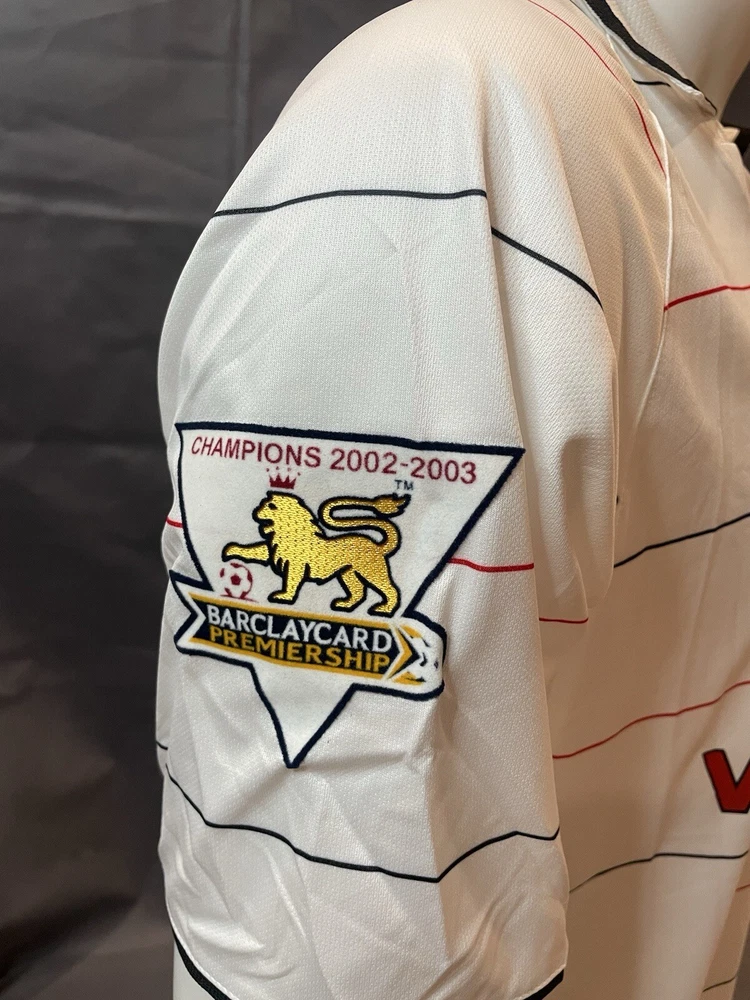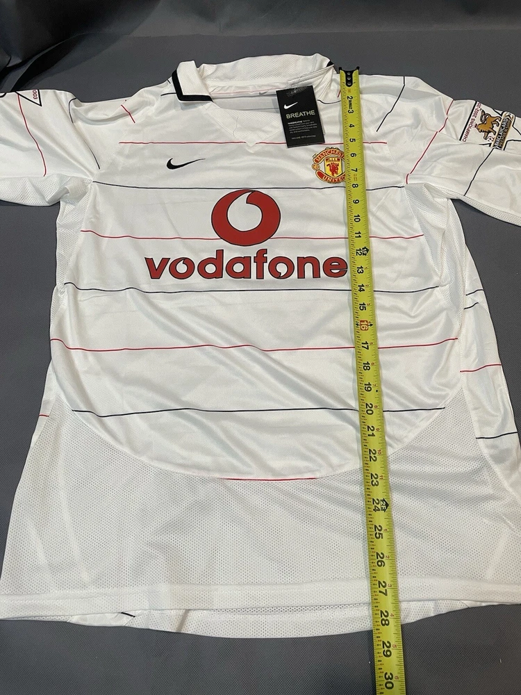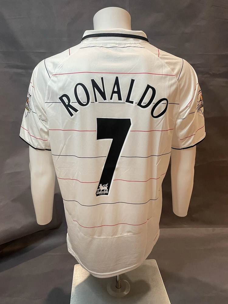 Show your love for Man United with this retro 2003-2005 away white jersey, featuring the legendary Ronaldo #7. This short sleeve jersey is perfect for any soccer fan, especially those who support Manchester United. The jersey is by Nike and is available in men's large size. The jersey is primarily white in color and features the iconic Manchester United logo on the chest. It's a great piece of fan apparel for any soccer match or game viewing party. This product is a must-have for any true Man United fan. Order as soon as possible to receive before the holiday if you have any questions lemme know