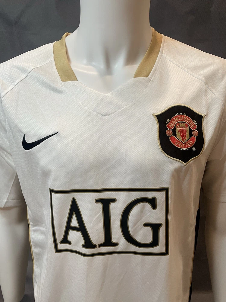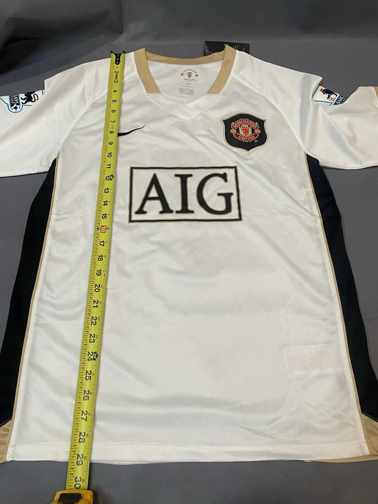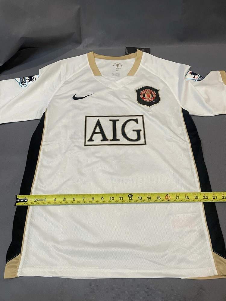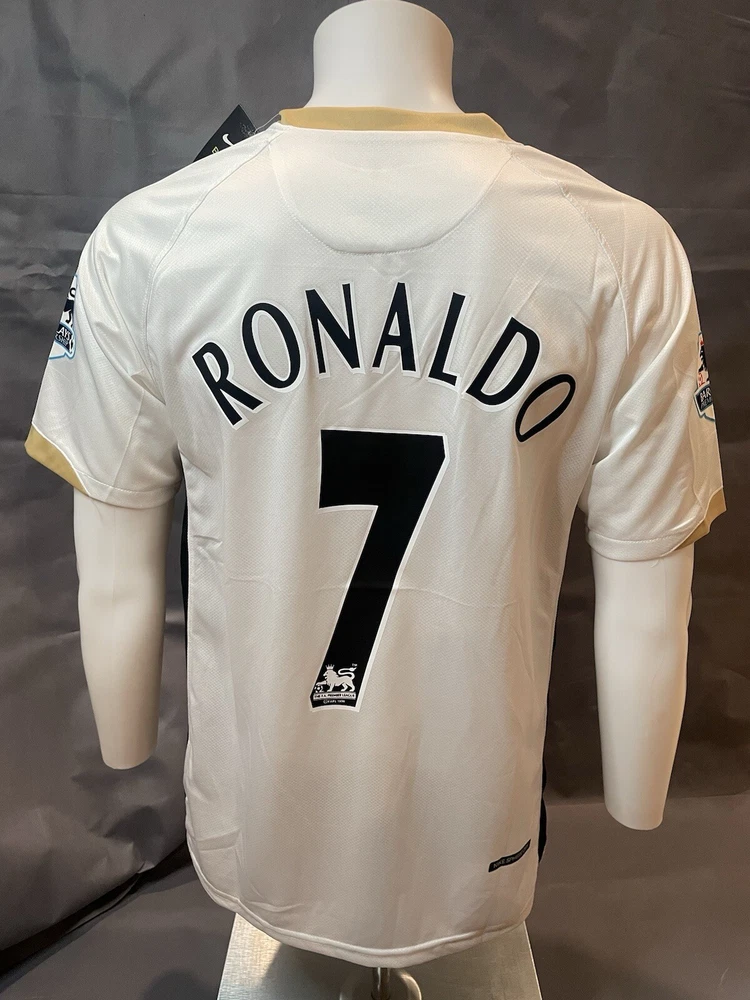 Show your support for Manchester United with this retro 06/07 away jersey featuring Cristiano Ronaldo's name and number. This white short-sleeved jersey is a size large and is perfect for any fan of the sport. The jersey is made for less than 8 oz capacity and is designed for men. It is a great addition to any soccer fan and is perfect for showing your team spirit at the next Premier League game. Order as soon as possible to receive before the holiday if you have any questions lemme know