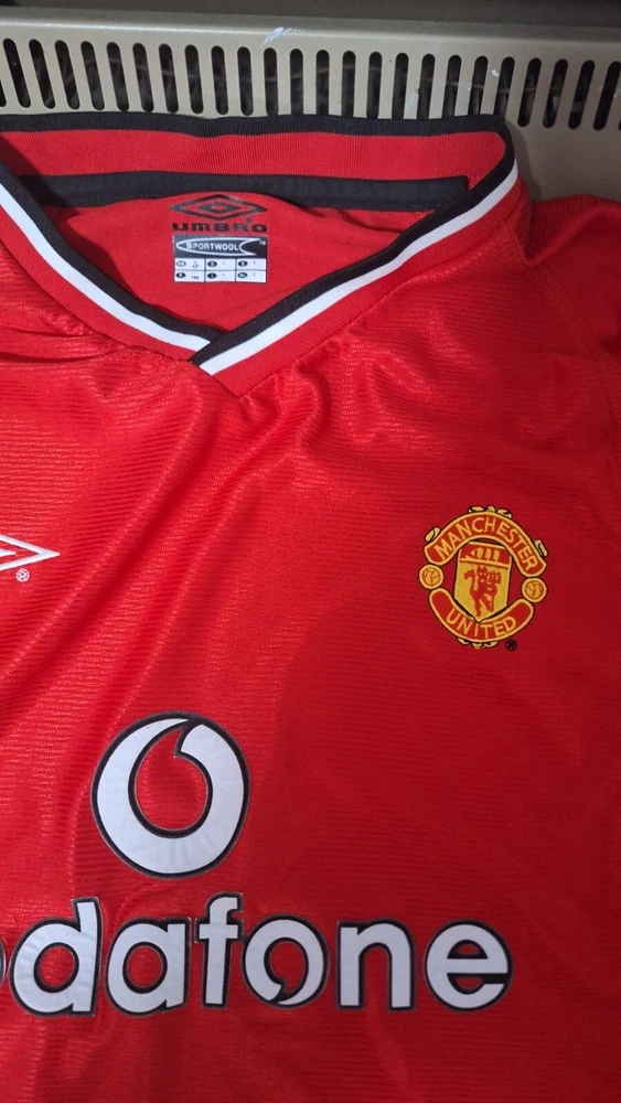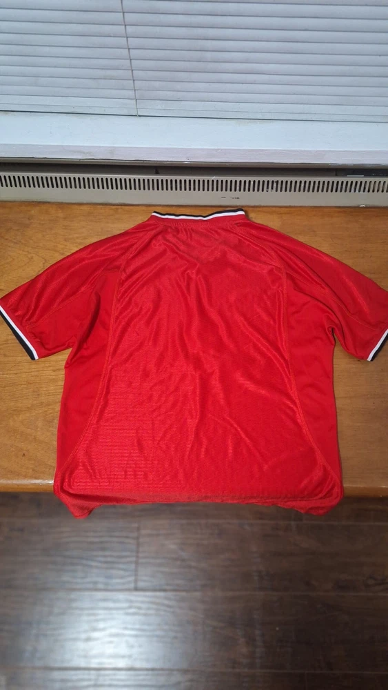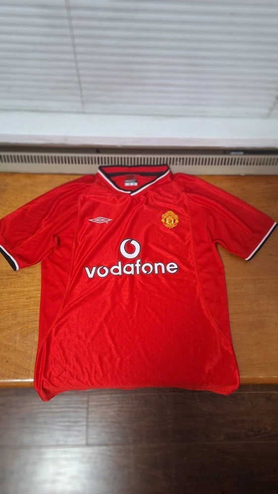 Embrace the legacy of one of the most celebrated football clubs with the Manchester United 2000 Home Retro Jersey. Manufactured by Umbro, this replica jersey is designed for fans who wish to honor the team's storied past. It comes in a vibrant red, synonymous with the team's iconic home kit, and is sized large to accommodate a comfortable fit.Crafted with attention to detail, this jersey features the renowned Manchester United crest, making it a must-have for collectors and supporters alike. Whether you're cheering from the stands or playing a match, this piece is a testament to your allegiance to the Red Devils and a nod to the prestigious Premier League heritage.