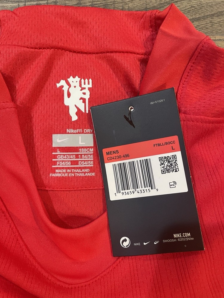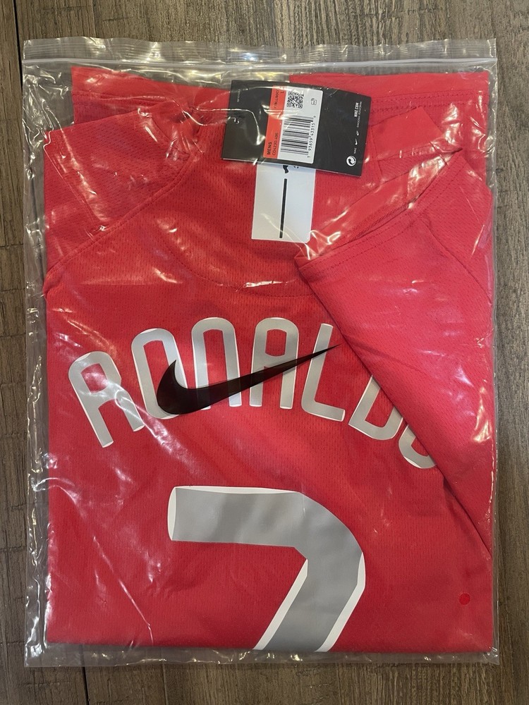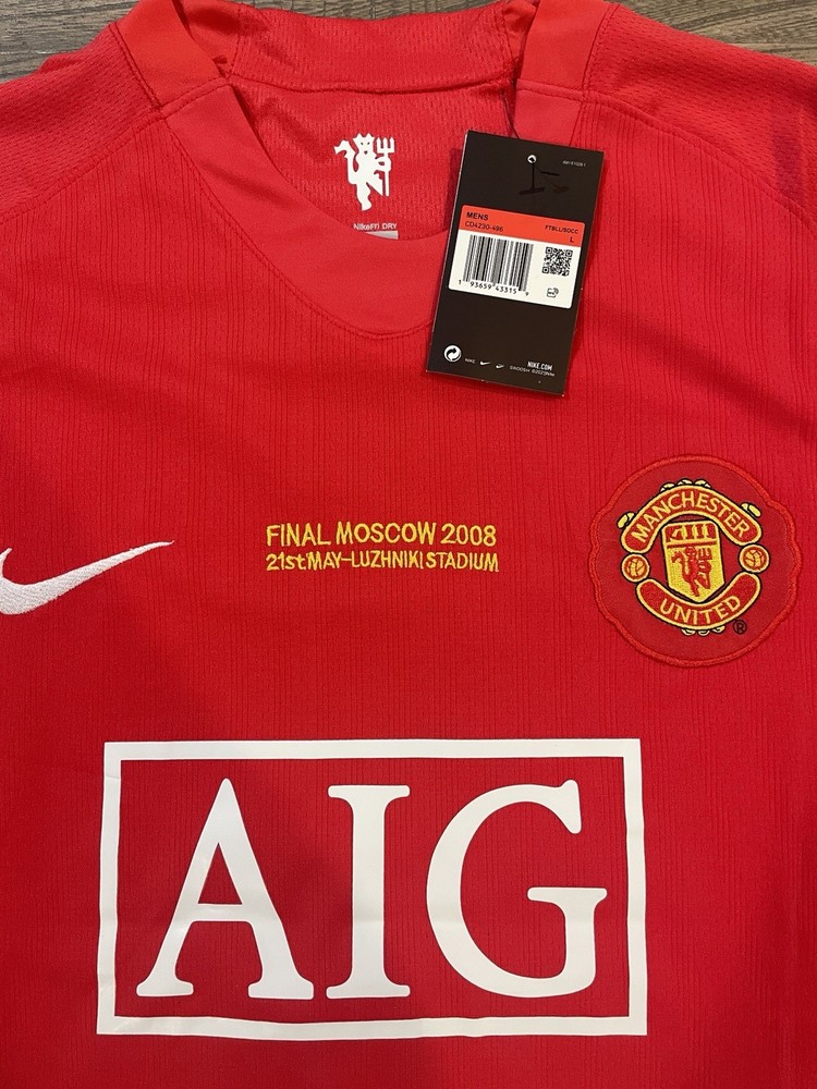 The product is a Manchester United 2007/08 Cristiano Ronaldo home red long sleeve UCL final soccer jersey by Nike. This officially licensed jersey is designed for men in size L and features the iconic red color and team logo. Perfect for fans of Manchester United and soccer enthusiasts alike, this jersey is a must-have for collectors and supporters of the team and player. Representing the iconic moments of Ronaldo's time at Manchester United, this jersey is a timeless piece of fan apparel for soccer fans.