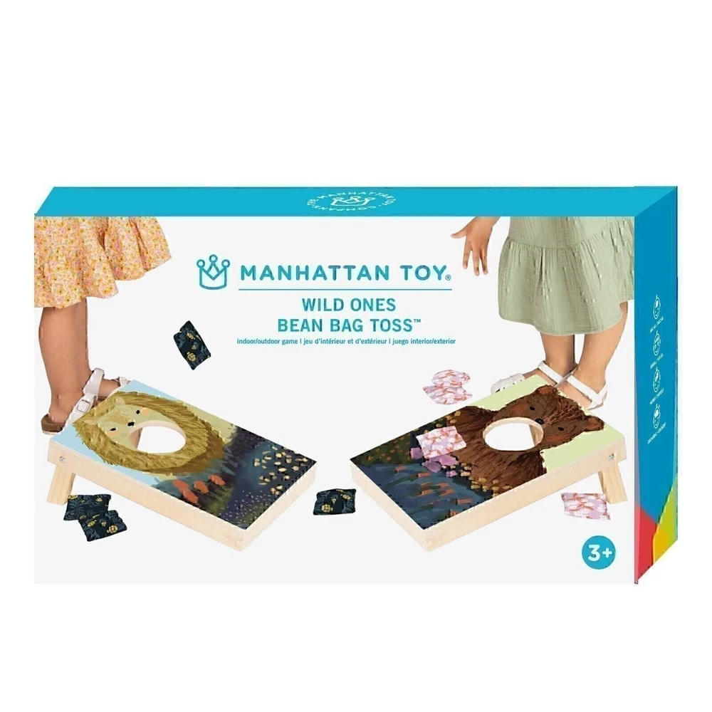 Wild Ones Bean Bag Toss Game This wonderful wood set for kids 3+ includes 2 boards and 8 patterned bean bags for some wild little-one fun! Introducing the Wild Ones Bean Bag Toss Game, a fun and wholesome way to entertain kids aged three and up! Crafted from high-quality wood, this cornhole board set will have your little ones tossing and laughing in no time! So get ready for some wild family fun--no matter the age, everyone's a winner. Suitable for ages 3 and up. Set includes 2 boards (one lion, one bear), 8 patterned bean bags (4 per player). Take turns tossing the beanbags and getting points. Encourages motor development, cooperation, and social learning skills through play. Store indoors when not in use. Key Features 2 boards (one lion, one bear). 8 patterned beans bags (4 per player). Encourages motor development. Specifications Comes boxed. Meets or exceeds ASTM, EN71 and CPSIA safety regulations. Gameplay instructions. Cleaning & Care Do not submerge in water; do not use in sanitizer, steamer, or, microwave; surface wash with damp soapy cloth, followed by a clean damp cloth to remove residue; or clean with baby safe pacifier wipes. If cleaning with baby-safe wipes: read the wipes label carefully; use as directed; test on small area first. CORNHOLE GAME SET FOR KIDS: The Wild Ones Decorative wooden cornhole play set for kids includes 2 boards with folding legs (a lion and bear) and 8 patterned bean bags (4 per player). MOTOR SKILL DEVELOPMENT TOY: Encourage toddlers 3 years and up in their motor skill development and hand-eye coordination skills with this fun and attractive bean bag toss activity playset. EDUCATIONAL TOY DISGUISED AS FUN: A fun game of bean bag toss is a good way to learn early social and communication skills as kids agree on rules, take turns tossing the bean bags – earning points for every bag that enters the hole in a friendly competition of skill. INDOOR OUTDOOR GAME FOR PRESCHOOLERS: While the Wild Ones bean bag toss set is an excellent backyard picnic game suitable for outdoor play in good weather, it's also an awesome indoor activity on rainy and cold days; animal theme corn hole boards measure 15.5"L x 9.5"W x 2"H with legs folded under; Ships in retail packaged box. STANDING BY OUR BRAND: If you're reading this, you've found a safe toy from a real company and a brand that cares. Since 1978, Manhattan Toy has been a trusted source of imaginative toys for babies, toddlers and kids of all ages. All of our toys are rigorously safety tested and every toy has our 800 number with a dedicated customer support team to answer your call.