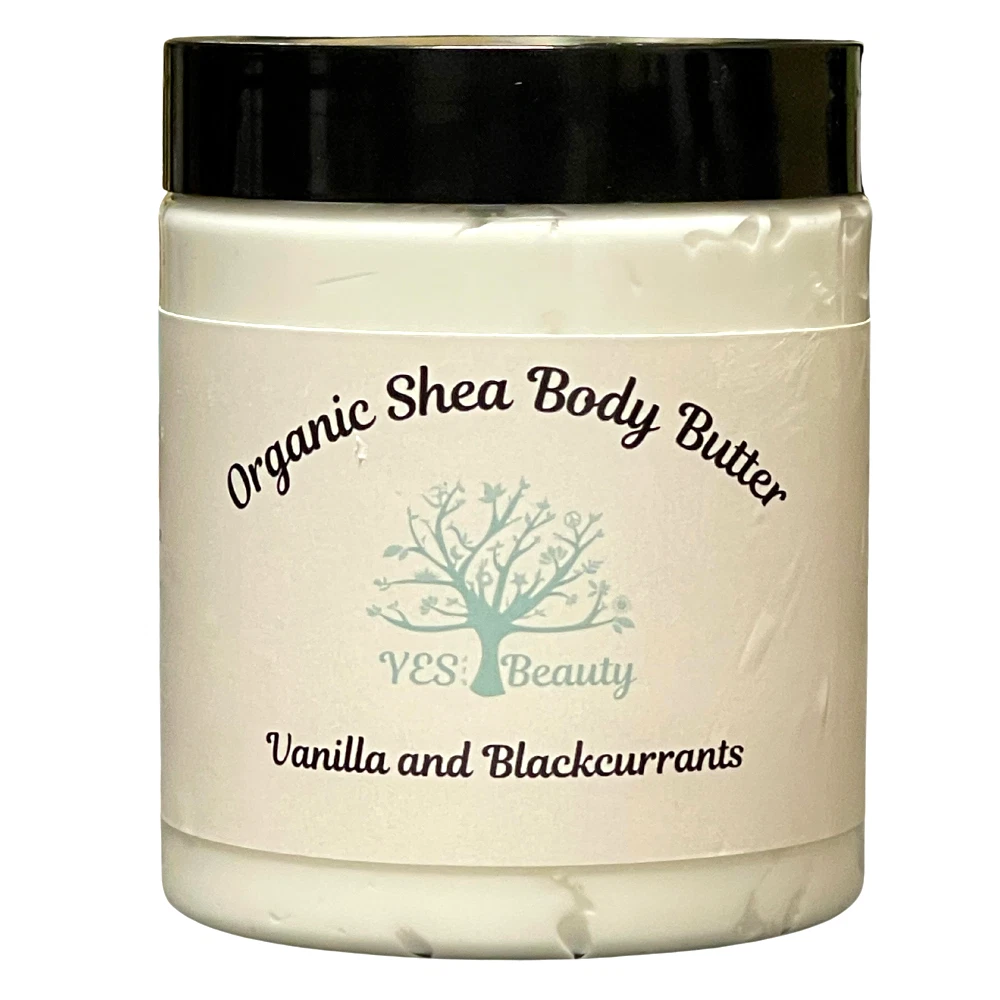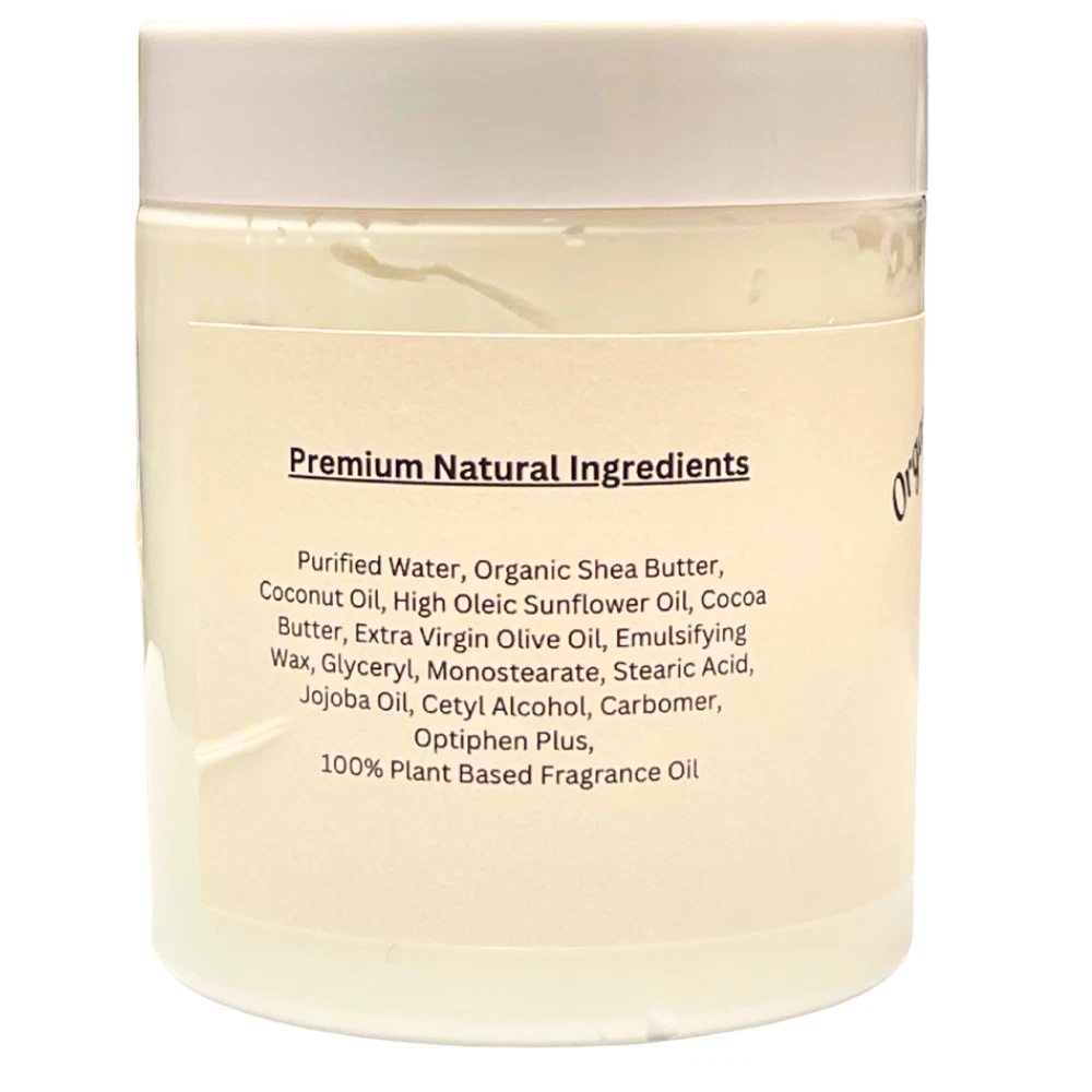 Our handmade Vanilla & Blackcurrants Organic Shea Body Butter is a luxurious indulgence for every skin type, offering a truly regal experience. Scrumptious red raspberries and blackcurrants swirled with golden vanilla and garnished with fresh citrus zest. Crafting our own Body Butter is a process that combines creativity with the finest natural ingredients The outcome is a product that not only moisturizes and soothes the skin but also reflects a personal touch. All jars & bottles are safety sealed by us prior to shipping! We use only safe, recyclable PET 1 bottles! With its irresistibly soft and creamy texture, it envelops your skin in pure bliss. This divine formula absorbs swiftly and completely, leaving no trace of greasiness behind. Crafted with a harmonious blend of cocoa butter and shea butter, it provides an intensely moisturizing treatment that is perfect for your hands, body, and feet, ensuring they stay hydrated and nourished throughout the day. Suitable for every skin type Our body butter was developed at the request of our customers. They asked us for a rich creamy blend that would moisturize without leaving ones skin oily or greasy. After many attempts at different formulas we believe we have come up with just the right combination of luxurious ingredients to give our quality customers the product that fits their needs. We let our ingredients do the talking! Purified Water, Organic Shea Butter, Coconut Oil, High Oleic Sunflower Oil, Cocoa Butter, Extra Virgin Olive Oil, Emulsifying Wax, Glyceryl, Monostearate, Stearic Acid, Jojoba Oil, Cetyl Alcohol, Carbomer, Optiphen Plus, Natural Fragrance Organic Shea Butter - Rich in fatty acids, clears excess oil while restoring moisture. lubricates the skin and creates a barrier to keep moisture in. A nti-inflammatory and healing properties, making it ideal for softening, conditioning, toning, and soothing the skin. Coconut Oil - Moisturizing dry skin, Reduces inflammation, A ntimicrobial properties Cocoa Butter - Works to naturally soothe dry, sensitive skin while reducing and preventing the appearance of scars and unwanted marks Jojoba Oil - Improves the look and feel of skin and hair, soothes irritation, and reduces the appearance of blemishes High Oleic Sunflower Oil - Helps improve skin hydration, reduce inflammation, speed up wound healing and improve skin elasticity. Extra Virgin Olive Oil - Brimming with skin benefits, main benefit is to moisturize the skin by reducing water loss Emulsifying Wax 93725SC - Vegetable based improves the consistency and stability of emulsions. Glyceryl Monostearate - Makes skin softer and smoother. It traps moisture on the skin and hair to prevent dehydration and damage. Stearic Acid - Helps with eczema, inflammation, and moisture Purified Water Cetyl Alcohol - Protects the skin from moisture loss and reduce the ability of allergens and bacteria to affect the skin. Carbomer - Safe for all skin types, carbomers are fluffy white powders that allow other ingredients in your products to work together to get the job done. Optiphen Plus - Broad Spectrem Preservative, versatile preservative is highly effective against a wide range of microorganisms, including bacteria, yeast, and mold. It ensures your formulations remain pristine and safe. F ormulated with sensitivity in mind. It is gentle on the skin Fragrance Oil