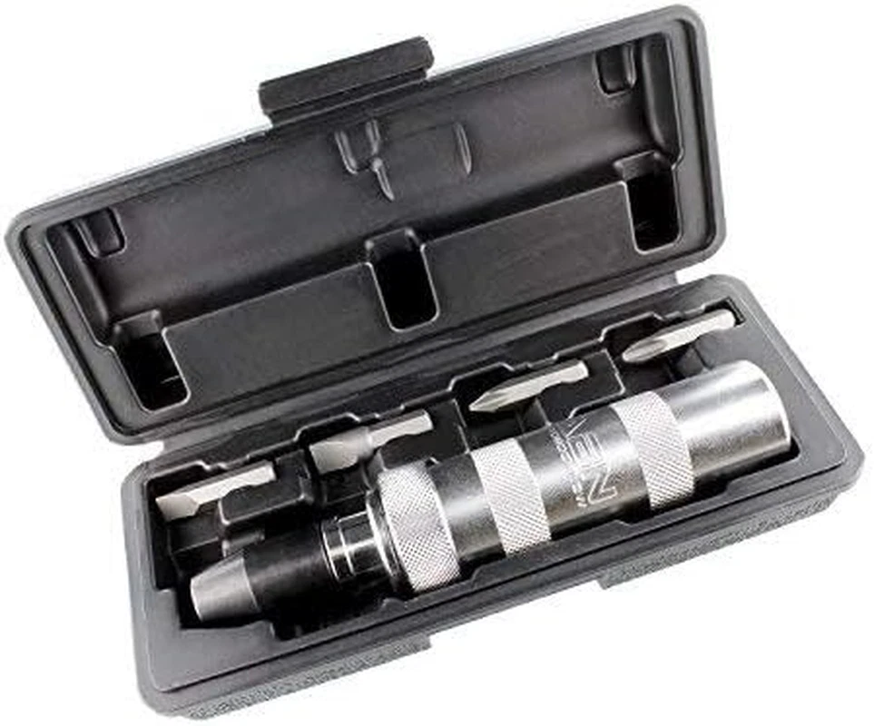 [Reverse Impact Driver Bit Set] Loosen rusted or frozen screws, or repair door locks, auto body fenders, and more by driving new screws with the ABN 3/8-inch Manual Impact Driver Screwdriver Punch Set [Tighten or Loosen any Screw] Dual-action reverse impact screw driver tool allows you to adjust towards the right to tighten screws or towards the left to loosen a screw; Single letter engravings, “L” and “R”, on handle ensure easy identification [High Torque Impact for Easy Use] Insert a bit into the hex bit adapter chuck then strike the end of the impact screw driver tool with a hammer; High torque force will drive screw 20 degrees in the direction your manual impact wrench is set [Built to Last] Chrome-plated impact manual driver ensures optimal strength and resistance to corrosion, while the knurled handle provides a sturdy grip on 3/8-inch precision-milled manual impact driver bits [Content] Manual impact screwdriver kit includes (1) handheld impact driver tool, (1) bit adapter, (2) Philips bits (No. 2 x 36mm and No. 3 x 36mm), (2) Flathead bits (8mm x 36mm and 10mm x 36mm) and a plastic storage case; Compatible with other 3/8-inch sockets and bits Product Description About the ABN | 3/8” Inch Drive Reversible Manual Impact Driver Set with Screwdriver Bits The ABN Hand Held Impact Driver Set uses the force of a hammer strike to create a high torque impact to tighten or loosen nuts, bolts, and screws allowing you to remove rusted, frozen, and stubborn fasteners with ease. Due to its compact and lightweight design, this impact screw remover is great for travel! Contents: Impact Tool, Adapter, Bits (hammer not included) Plastic Storage Case Heavy-duty plastic blow-molded case provides compact storage, easy organization, and safe transportation. 7.8 x 3.3 x 2 inches Sturdy Latch Keeps Tool in Place High Torque Manual Impact Tool Contents 3/8 inch impact driver tool is designed to fit 3/8 inch bits and sockets. The 1.6 lb. (.7 kg) impact driver is lightweight and easy to maneuver. 3/8 inch hex bit adapter Phillips bits: No. 2 x 36mm and No. 3 x 36mm Flat bits 8mm x 36mm and 10mm x 36mm EASY TO USE Insert a suitable bit into the bit adapter and set the bit in screw head. Strike the end of the tool handle with a hammer to turn drive 20 degrees in desired direction. To use as a socket wrench, release the bit adapter, then use 3/8-inch impact drive sockets in similar fashion. This tool works without air or electrical components, making it incredibly easy for anyone to use. (Hammer not included.) Always remove any dirt buildup from the screw to prevent damage to the screw head and use protective gear to prevent injury. A Closer Look ERGONOMIC HANDLE This unique tool uses the force of a hammer strike to create a high torque impact to install and remove screws and nuts. This hammer impact tool provides a sturdy grip with its slip-resistant handle, and chrome plating to resist corrosion and rust. “L” AND “R” DIRECTION Features permanently etched left and right directional markings on the front end of the handle. Adjustments can be made by pushing and turning top of the impact screw driver. Just remember "Right-y Tight-y, Left-y Loose-y"! REMOVABLE ADAPTER Removable hex bit adapter compatible with various bit sizes including the provided Phillips and Flathead bits. Male square ball drive is compatible with 3/8 inch female attachments or sockets. Who We Are Auto Body Now is a family owned company based out of South Dakota. We provide the Midwest with the highest quality auto body supplies and car care products on the market. We have an exceptionally strong presence on , shipping over 50,000 products each month. In fact, if you have purchased any of your auto body supplies or car care supplies online, there is a good chance we have had the opportunity to serve you.