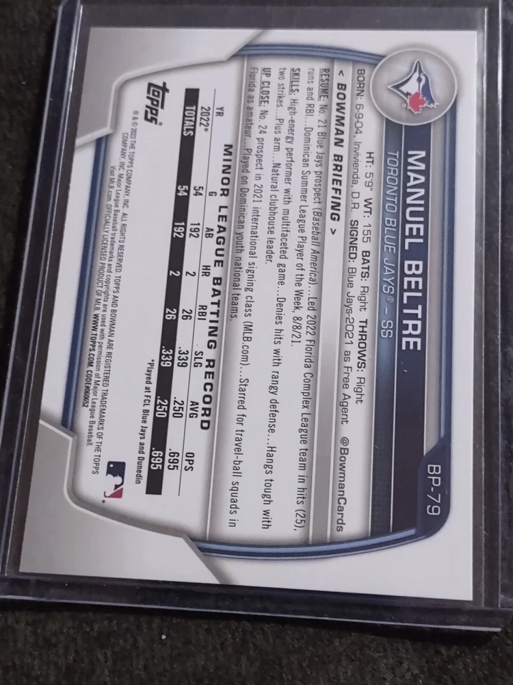 Manuel Beltre Prospect Rookie Card 2023 Bowman Base #BP-79 Toronto Blue Jays.
