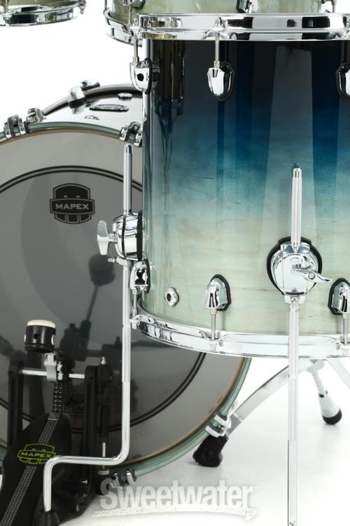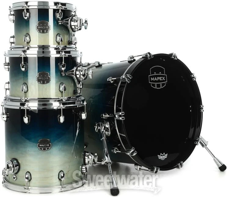 The Classic Saturn Sound — Now Better Than Ever The latest Mapex Saturn Series shell packs blend time-honored maple/walnut shells with bleeding-edge shell tech borrowed from the Black Panther Design Lab — along with enough jaw-dropping finish options to please a wide range of drummer tastes. Each piece in this set has been molded to meet the needs of demands of stage and studio professionals. You get thin, 6-ply hybrid shells crowned with Mapex's precision SONIClear bearing edges, Remo USA heads, and Mapex Power Hoops to deliver great tone and tuneability from day one. You also get Mapex's advanced shell venting, suspension tom mounting, and floating SAS floor tom legs for excellent note length and projection. Factor in those iconic Saturn Series badges and lugs, and the Mapex Saturn from Sweetwater is a clear winner in its class.Saturn Shell Technology 6-ply maple/walnut shells The secret to the classic Saturn sound Sweetwater is an Authorized Mapex Dealer Genuine New Item Sweetwater's 2-year warranty Mapex Saturn SR504X 4-piece Fusion Shell Pack - Teal Blue Fade 4-piece Maple/Walnut Shell Pack with 10" and 12" Toms, 14" Floor Tom, and 20" Bass Drum - Teal Blue Fade The Classic Saturn Sound — Now Better Than Ever The latest Mapex Saturn Series shell packs blend time-honored maple/walnut shells with bleeding-edge shell tech borrowed from the Black Panther Design Lab — along with enough jaw-dropping finish options to please a wide range of drummer tastes. Each piece in this set has been molded to meet the needs of demands of stage and studio professionals. You get thin, 6-ply hybrid shells crowned with Mapex's precision SONIClear bearing edges, Remo USA heads, and Mapex Power Hoops to deliver great tone and tuneability from day one. You also get Mapex's advanced shell venting, suspension tom mounting, and floating SAS floor tom legs for excellent note length and projection. Factor in those iconic Saturn Series badges and lugs, and the Mapex Saturn from Sweetwater is a clear winner in its class. Saturn Shell Technology 6-ply maple/walnut shells The secret to the classic Saturn sound is the thin maple-walnut shell formulation. The 4-ply maple exterior supplies ample cut and projection in a live setting. And the 2-ply walnut core provides a chewy darkness and growling resonance to serve drummers in the studio. In concert, these tonewoods give each shell in the Saturn shell pack a strong attack and rich, lingering sustain. SONIClear bearing edges Better tone and easier tuning — that's what you can expect across the range of Saturn series toms and kick drums. Mapex's precision SONIClear bearing edges allow heads to sit flatter and thus make better contact with the shell. This results in better seating and a stronger, deeper fundamental. In our experience, just finger-tightening heads was enough to make these Saturn drums sing. This widens the tuning range for players who like deeper toms and kick drums while producing purer musical pitches in higher registers. Mapex Power Hoops Rugged steel 2.3mm triple-flanged Power Hoops give each Saturn Series shell a commanding voice and presence, along with enough durability to survive a national tour. Black Panther Design Lab Hardware Nodal Line Air Flow Venting Scheme When it comes to drums, feel is every bit as important as tone. The Mapex Saturn shell pack features vents placed along the nodal line of every shell — a concept borrowed from the Black Panther Design Lab. This gives each drum an open, lively response while serving to maximize the shell's natural resonance in any tuning register. SAS Static Floor Tom Legs "The shortest path between two points is a straight line." Remember that lesson from geometry class? Archimedes said it. And as it turns out, sound and vibrations work on the same principle. Mapex's SAS floor tom legs feature sharp 90° angles to increase distance from the floor to the shell. This allows less of your tom sustain to be absorbed into the floor, which means greater note length and a cleaner soundstage. Sonic Pedestal Floor Tom Feet Mapex's SAS floor tom feet — again borrowed from the Black Panther Design Lab — do a great job at floating floor tom shells in order to prevent the earth or stage from leaching away your hard-earned depth and resonance. Paired with the SAS 90° legs, it makes for an impressive nearfield response from behind the kit. SONIClear suspension mounts The Saturn Series's low-profile SONIClear suspension mounts prevent tom energy from being absorbed into the hardware, allowing the true voice of the heads and shells to ring out. These mounts don't touch the tension rods in any way. The advantages of this are threefold. Tom sustain never gets choked out by the hardware Heads stay in tune much longer Head changes are quicker, with no need to remove shells from mounts Ready to Rock with Remo USA Heads Your Saturn shell pack includes a full set of Mapex-branded Remo heads for an accurate representation of the tones that lie within. Sweetwater couldn't have picked a better pairing ourselves. Toms come crowned with two-ply Emperor Clear batter heads for a time-honored studio tone. The bass drum is treated to a Powerstroke P3 Clear batter head for a modern attack and lasting life. Mapex Saturn Fusion 4-piece Shell Pack Features: The classic Saturn sound — now better than ever Jam-packed with Black Panther Design Lab features and hardware 6-ply maple/walnut shells boast a strong attack and growling sustain SONIClear bearing edges maximize tone and tuning range Nodal Line Air Flow Vents improve resonance and response Tone-enhancing SONIClear tom hardware lets shells and heads ring true Toms include Remo Emperor Clears for a time-honored studio tone Kick drum includes a Remo Powerstroke P3 Clear for a modern attack Includes suspension tom mounts and floor tom legs; all other hardware sold separately Cymbals, stands, and snare not included Specification Detail Finish Teal Blue Fade Configuration Shel