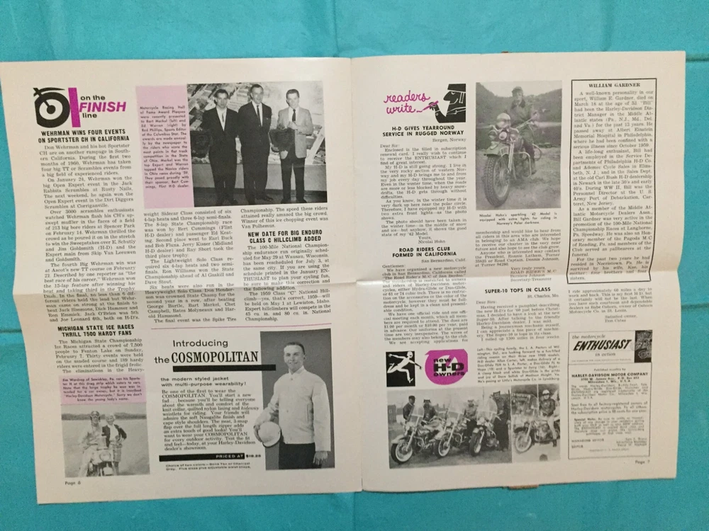 ITEM:::: This Listing is for an original March 1960 issue of HARLEY-DAVIDSON "ENTHUSIAST MAGAZINE" Motorcycle Dealer Sales Magazine..... . DIMENSIONS:::: About 9 by 6 inches and it unfolds 1 time; then there are 8 larger pages with covers.. ...... CONDITION:::: The general overall condition is G/VG ...... (Please refer to pictures & e-mail for details). ......... ABREVIATIONS:::: E=Excellent with no issues..... VG = Very Good with very lite issues..... G/VG = Good to Very Good with lite issues..... G + = Good+ with lite to moderate issues..... G = Good with moderate issues..... G - = Good- with moderate+ issues..... F/G = Fair to Good with quite a few issues..... F = Fair with many issues..... P = Poor with lots of issues..... Please let the pictures help you decide condition because they are an integral part of the description! Please e-mail with questions...... I will combine shipping & you will only pay $6.98 for shipping no matter how many items you accumulate! You can take up to 30 days to accumulate Items for combined shipping. Please drop me a note after your 1st win letting me know that you intend to wait to pay so that you can take advantage of combined shipping...... I will ship your Package to the address that you have registered on EBAY---Ergo, I will ship to the address that is on the shipping label when I print it from EBAY---Please do not ask me to ship to any other address---I will not do it! My goal is 100% satisfaction! I will refund 100% of your costs if you are not satisfied! Thanks for visiting!