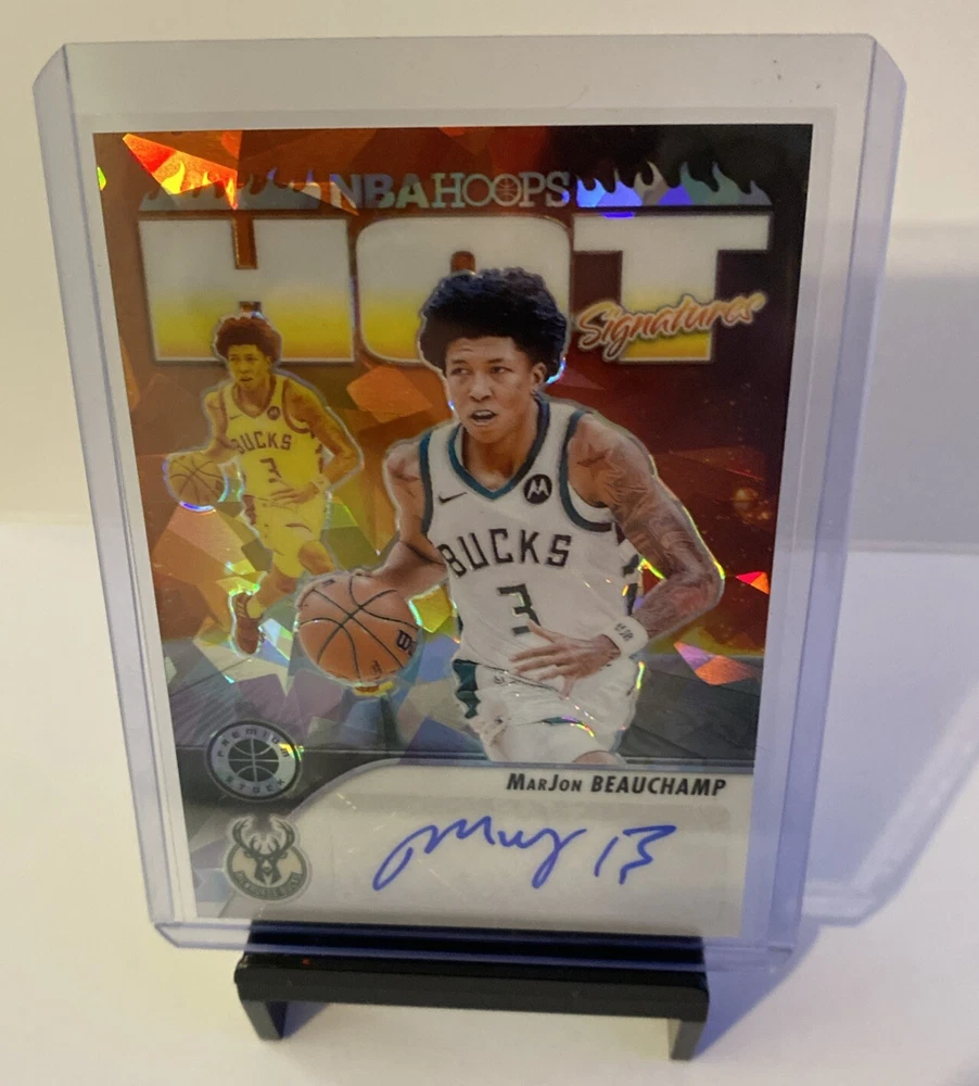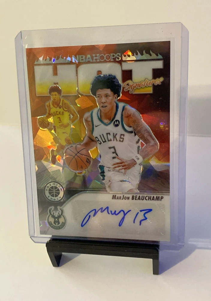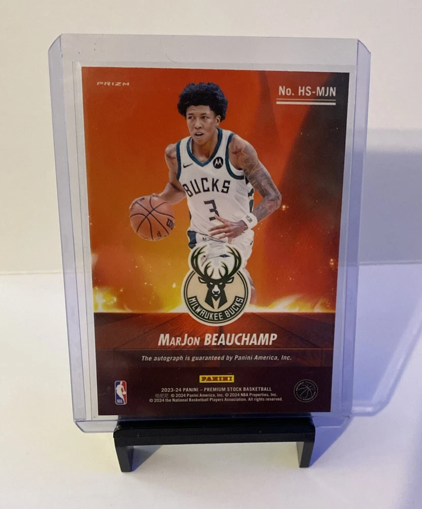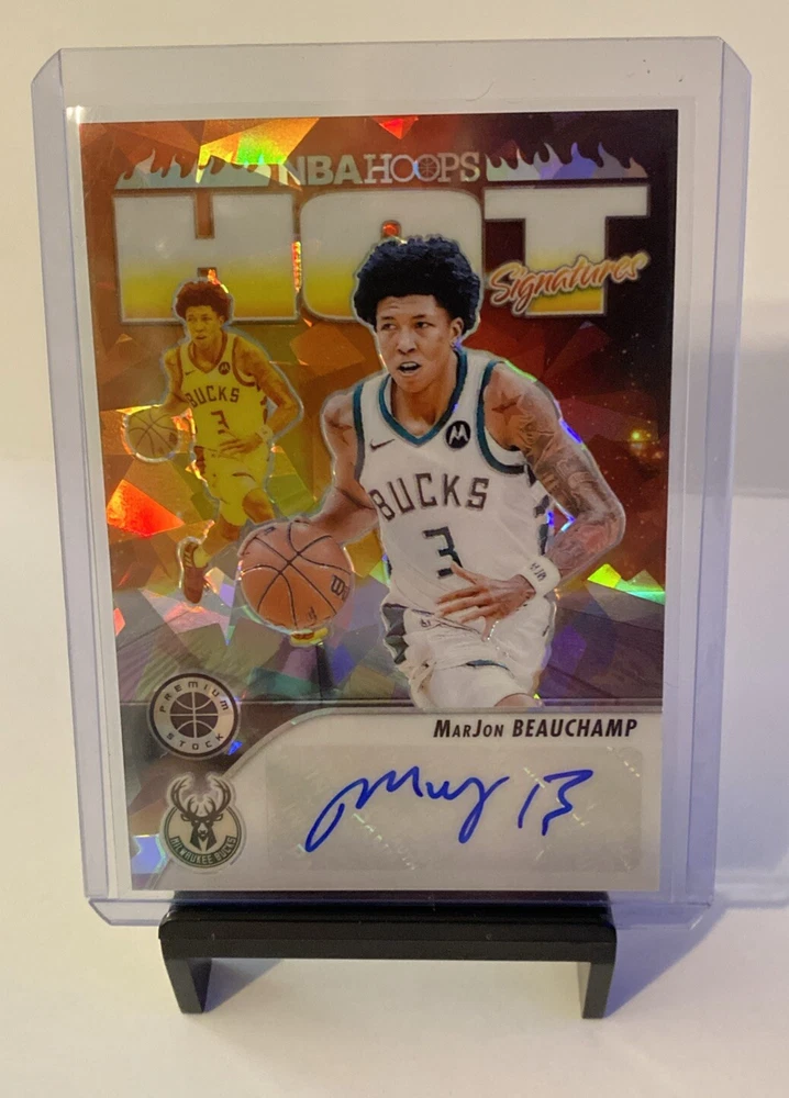 This is a rare and highly sought-after MarJon Beauchamp Hot Signatures Scope Bucks 2023-24 Panini NBA Premium Stock trading card. It features an authentic autograph from the Milwaukee Bucks player and is a must-have for any basketball card collector. The card is in excellent shape, with a label or sticker autograph format that adds to its value. In addition, this sports trading card has a serial number and is a parallel/variety, making it an original and unique piece. It was manufactured by Panini in 2024 and is part of the 2023-24 Panini Premium Stock set. Don't miss out on the chance to add this stunning card to your collection today!