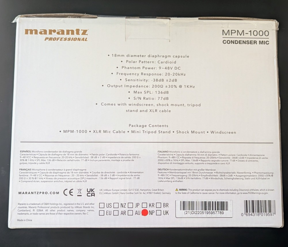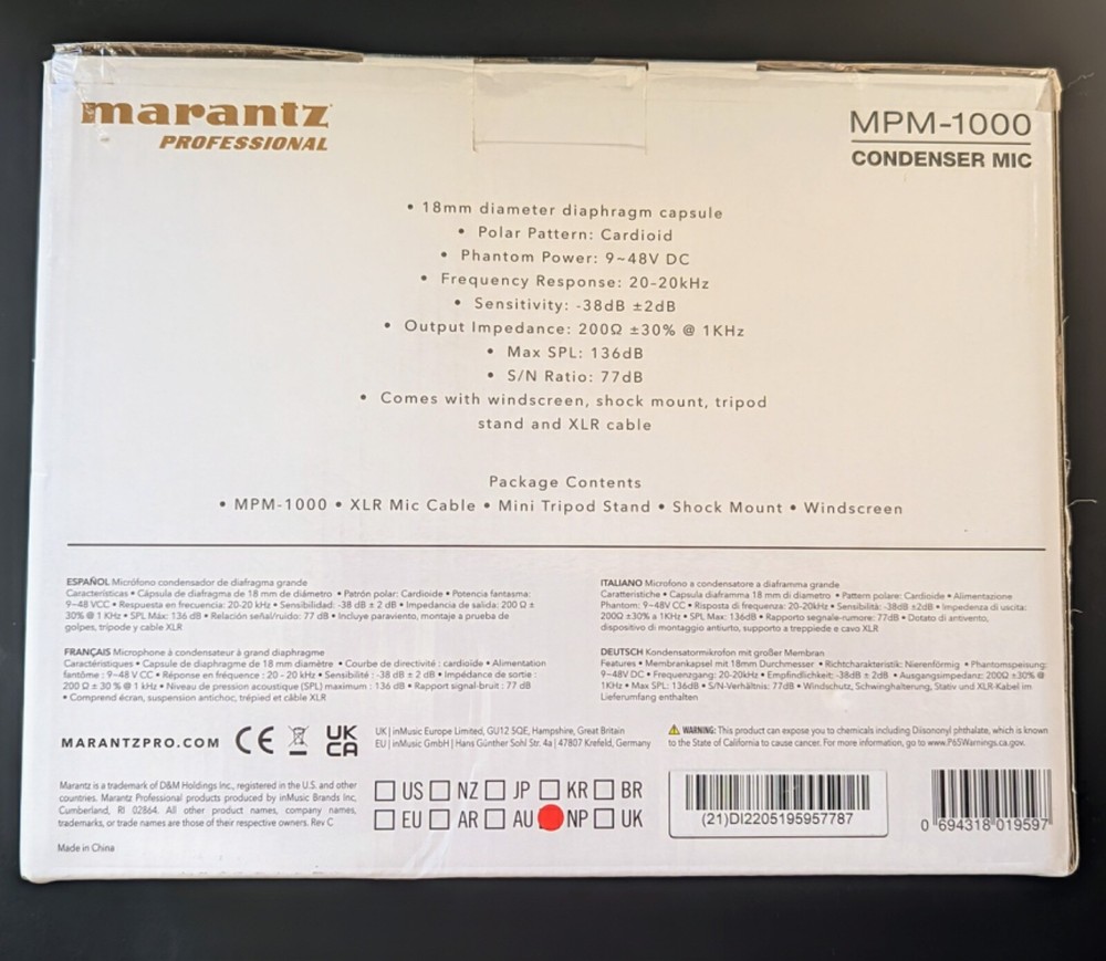 Marantz MPM-1000 Studio Recording Condenser Microphone is a top choice for studio recording, featuring a cardioid polar pattern and 18mm diaphragm size for clear and precise audio capture. This phantom powered microphone is designed for professional use, with a sleek and durable build. The Marantz brand is known for its high-quality audio equipment, making this microphone a reliable option for musicians and content creators alike. These are new in box, however the boxes show some signs of wear.