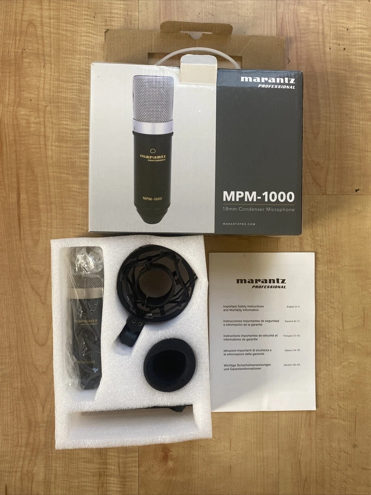Experience professional studio sound quality with the Marantz MPM-1000 condenser microphone. This high-quality microphone is perfect for studio recording and can be used with both wireless and wired connectivity. Its built-in windscreen ensures clear audio without any interference, while the phantom power feature further enhances the microphone's performance. The Marantz MPM-1000 is suitable for a wide range of applications, from vocals to instruments. Its form factor makes it easy to handle and the brand's reputation for quality ensures a reliable and long-lasting product. Upgrade your recording setup today with the Marantz MPM-1000 condenser microphone. Missing one rubber shoe on stand. Does not affect performance mic works great!