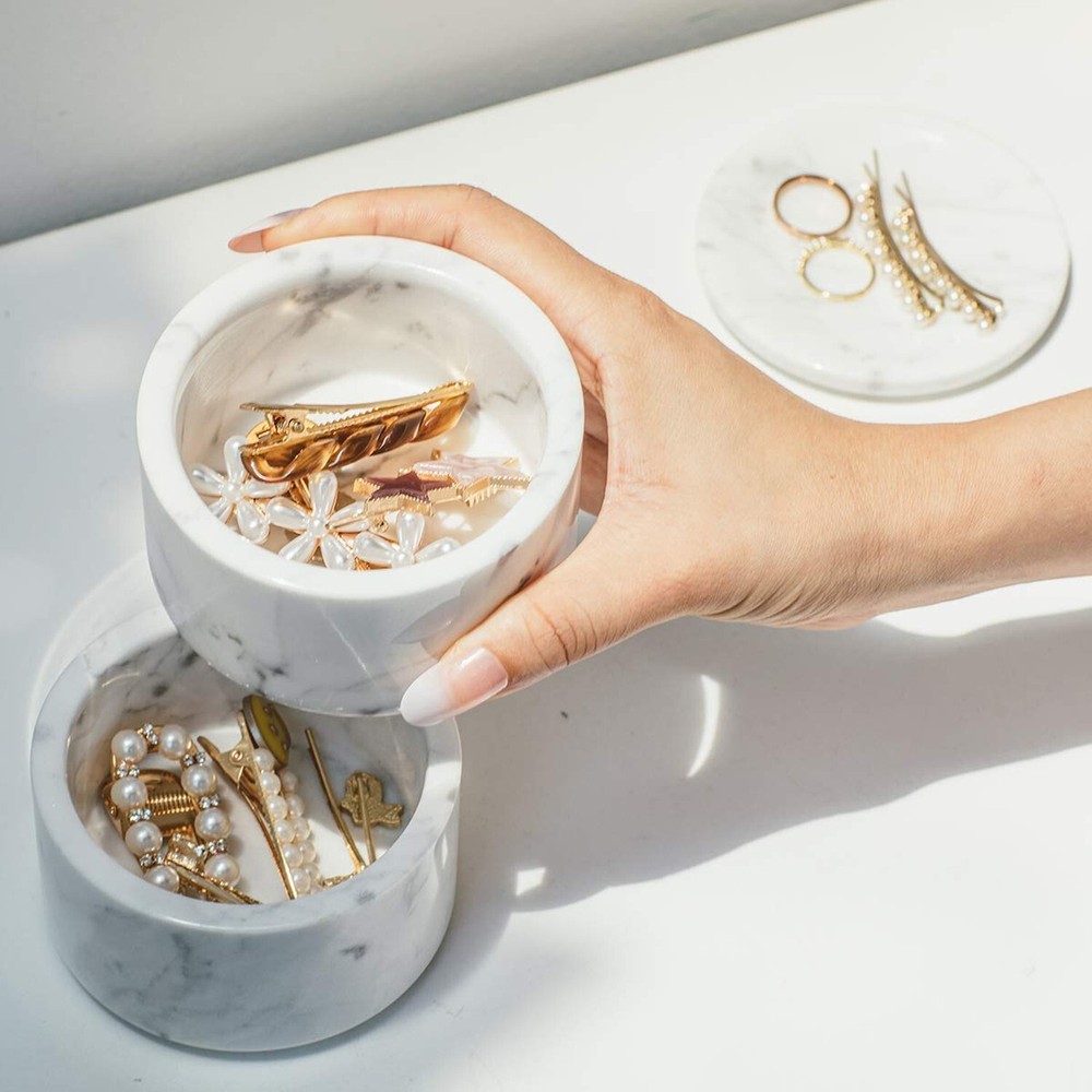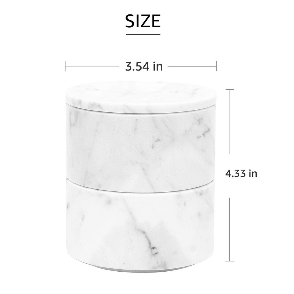 Marble Jewelry Box Organizer Two-Tier Resin Storage Container with Removable Lid for Ring Necklace Bracelet Earrings, Rings and Accessories - Buy Now with Fast Shipping! Marble Jewelry Box Organizer Two-Tier Resin Storage Container with Removable Lid for Ring Necklace Bracelet Earrings, Rings and Accessories Product Details Color: Two-layers Brand: JIMEI Material: Marble Style: Two-layers Special Feature: Jewelry Organizer,Large Capacity,Removable Recommended Uses For Product: Ring Product Dimensions: 3.54"D x 3.54"W x 4.33"H Target Audience: Women Shape: Cylindrical Finish Type: Polished Color: Two-layers Brand: JIMEI Material: Marble Style: Two-layers Special Feature: Jewelry Organizer,Large Capacity,Removable Recommended Uses For Product: Ring Product Dimensions: 3.54"D x 3.54"W x 4.33"H Target Audience: Women Shape: Cylindrical Finish Type: Polished Inner Material: Marble Number of Drawers: 2 Item Weight: 16 ounces Number of Compartments: 4 Jewelry Storage Type: Jewelry Box Number of Items: 1 Manufacturer: JIMEI Occasion: Wedding, Christmas, Birthday Mounting Type: Table Top Closure Type: Drawstring Item Weight: 1 pounds Country of Origin: China Size: Two-layers Finish: Polished Item Package Quantity: 1 Number Of Pieces: 1 Special Features: Jewelry Organizer,Large Capacity,Removable Batteries Included?: No Batteries Required?: No Date First Available: September 2, 2020 Key Features ✅ 100% marble ✅ Natural Material -- JIMEI Marble Jewelry Box Organizer is made of superior Italian Carrara Marble, the color and texture of each box is different, unique of natural, and gifted with expert crafting and optimizing procedure. ✅ Easy Storage -- JIMEI jewelry organizer is with unique space-save single layer/ two-tier design and removable box & lid. You can place the jewelry organizer any style as you like, stack them , separate them, or place the bowls side-by-side, keeping your favorite jewelry in a more funny way. ✅ Multi-Functional And Large Capacity -- Perfect to store jewelry like rings, earrings, bracelets, necklaces, brooches, also great for hair ties, hair pins and other small personal adornments. And it is good for storing nuts, candy, cookies, coffee beans, chocolates, trinkets and more. It is also a good helper for kitchen storage, which can be used to store spices and seasonings. ✅ Versatile & Expandable: JIMEI Jewelry Box s lid is also made from marble and doubles as a display tray that can be used to sort or display your jewelry. Expand your options by pairing the JIMEI Jewelry box. Elegant design shows a graceful and artistic feeling in your home. ✅ Durable & Easy to clean -- Durable marble material, easy to clean, Most parts of the box are hand polished. Marble texture may be different as they are manually poured. Product Description