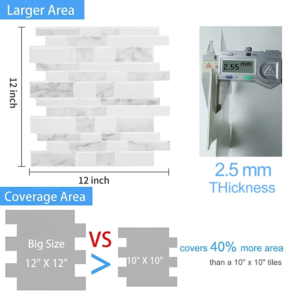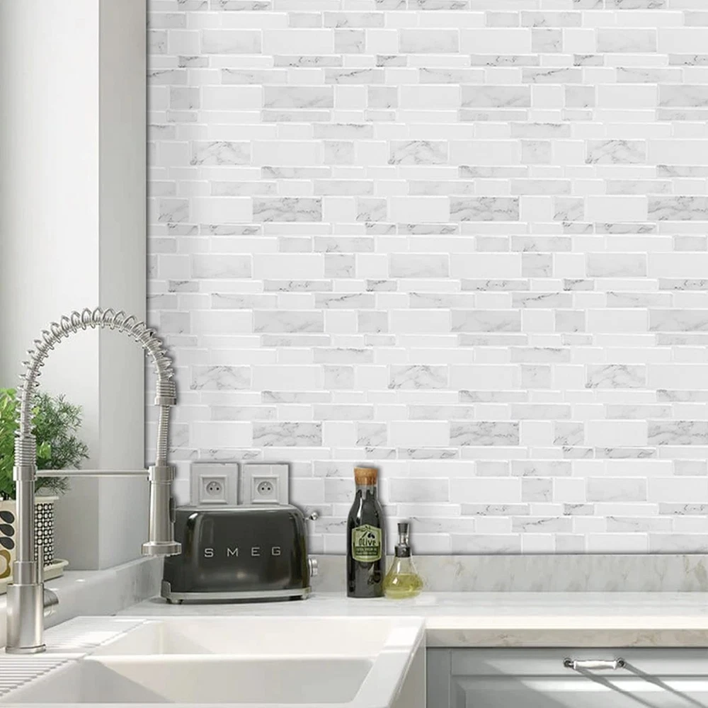 Peel and Stick Backsplash 3D Gel-like Surface The peel and stick backsplash with a realistic and non-transparent tile look ditional tiles(real ceramic tile), our tiles are thin, lightweight, yet durable. They are easy to install Easily cut and trim with a blade cutter or scissors for your space, perfect for, kitchen and bathroom backsplash, wall, fireplace, rv. Due to different shooting methods and display screen resolution setting, the actual color of the product may be different from that on the website. If there has any questions or concerns by received product and product installation, please contact us in time. Features Easy cut and trim, heat shield, waterproof Easy DIY, peel and stick on backplash Stronger adhesive, no extra glue or grout required Light-weighted, soft and elastic, flexible Easy clean and maintenance(maintain with a damp cloth or sponge.) How to Install Before you use this project, clean the wall surface before installing and make sure that the wall is dry. Used on the surface of your flat and smooth, non-porous, and non-crumbling wall surfaces space including kitchen, bathroom, laundry room, worktop, etc. DO NOT APPLY on uneven, textured surfaces, greasy, oily, brick, porous wood, or gypsum walls directly. NOTE: The new painting wall need to dry for 3 weeks before install peel and stick tile. NOT all the latex/repainted walls can be installed directly, for rough surfaces and heavy textured walls, please follow the instruction: 1.Sand the surface with sanding paper or spackling paste 2.Clean the wall with damp cloth 3.Wait until the wall is totally dry Spray the adhesive more on the joint area on both wall and tiles