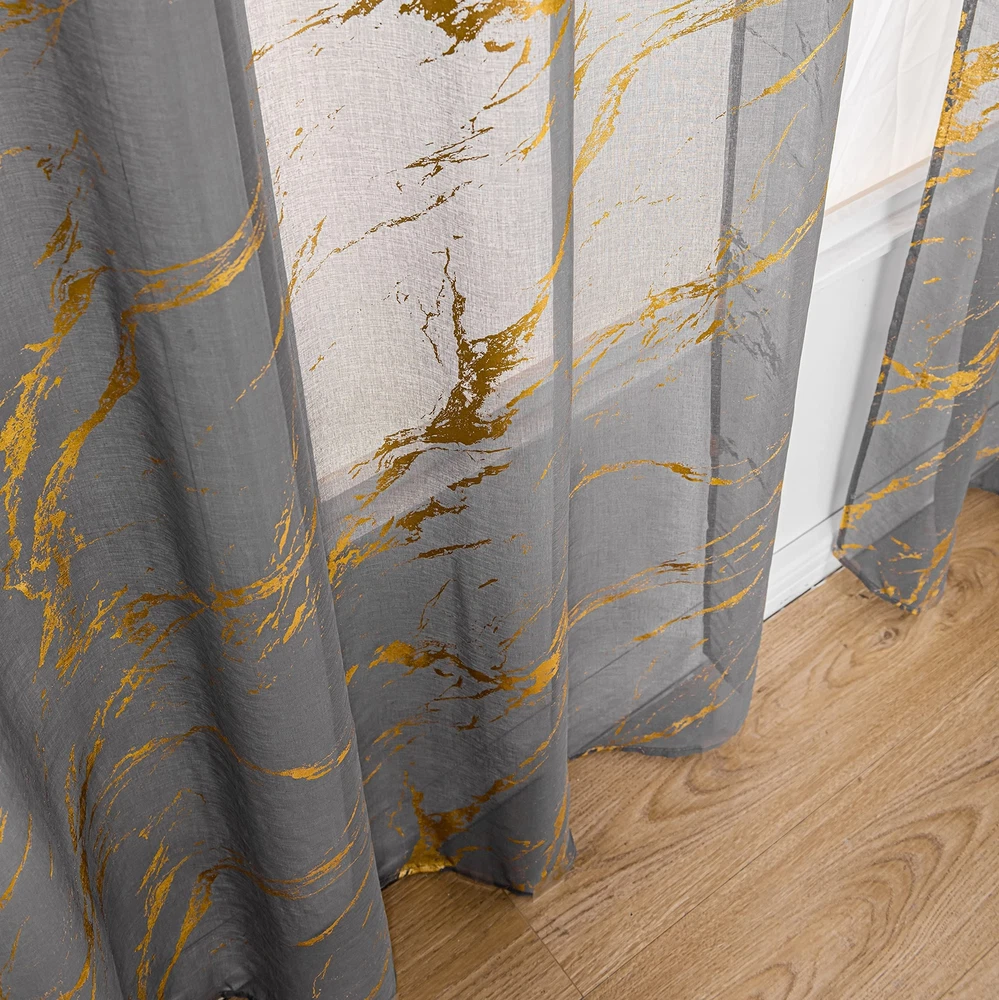 【Ready-Made】sheer curtains are made of 100% high quality polyester fabric. package included 2 panels, each panel measures width 52 inch by length 84 inch.Top 3" rod pocket design fits the most rod, easy to hang up. 【Gold Foil Print】These fancy sheer curtains designed with bronzing foil printed marble pattern which brings modern and fashionable feelings to your room. 【Sheer Privacy】These sheer curtains keep your privacy while allowing some light to filter through. Also it is airy breathable and let the fresh air filled in your house. 【Multi Occasions】Luxury look with a bit tropical stylish. They could be decorated in your bedroom, living room, dinning room, kitchen, room, office ,and Halloween decor etc. 【Easy Care】: Machine washable in cool water, recommend hand wash. gentle cycle, do not bleach, can be ironed at low temperature. Please tell us via if you have any problems about these products.