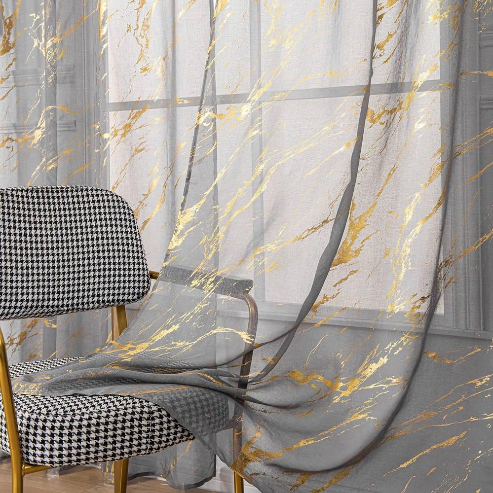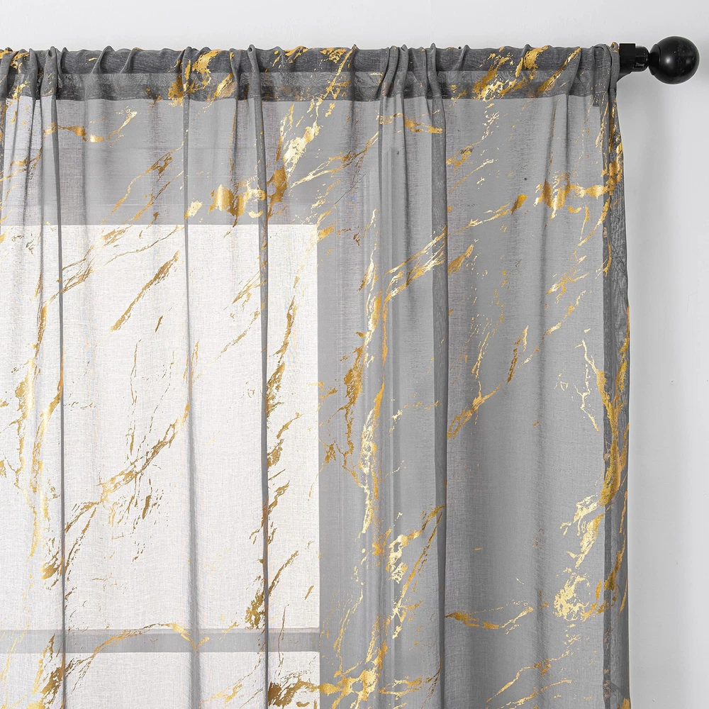 Marble Sheer Curtains 84 Inch Length 2 Panels Set, Gold Foil Print Metallic B...