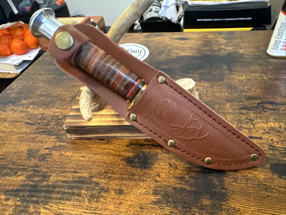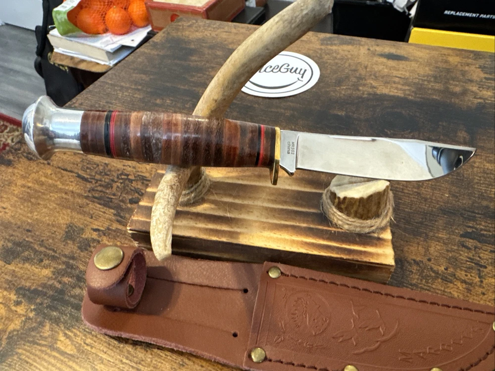 The Marbles MR302 fixed blade hunting knife features a stainless steel blade with a plain edge, measuring between 3.5 and 4 inches. This ambidextrous knife comes in a silver color and includes a Marbles sheath. Please note that the box is not included with this collectible item.