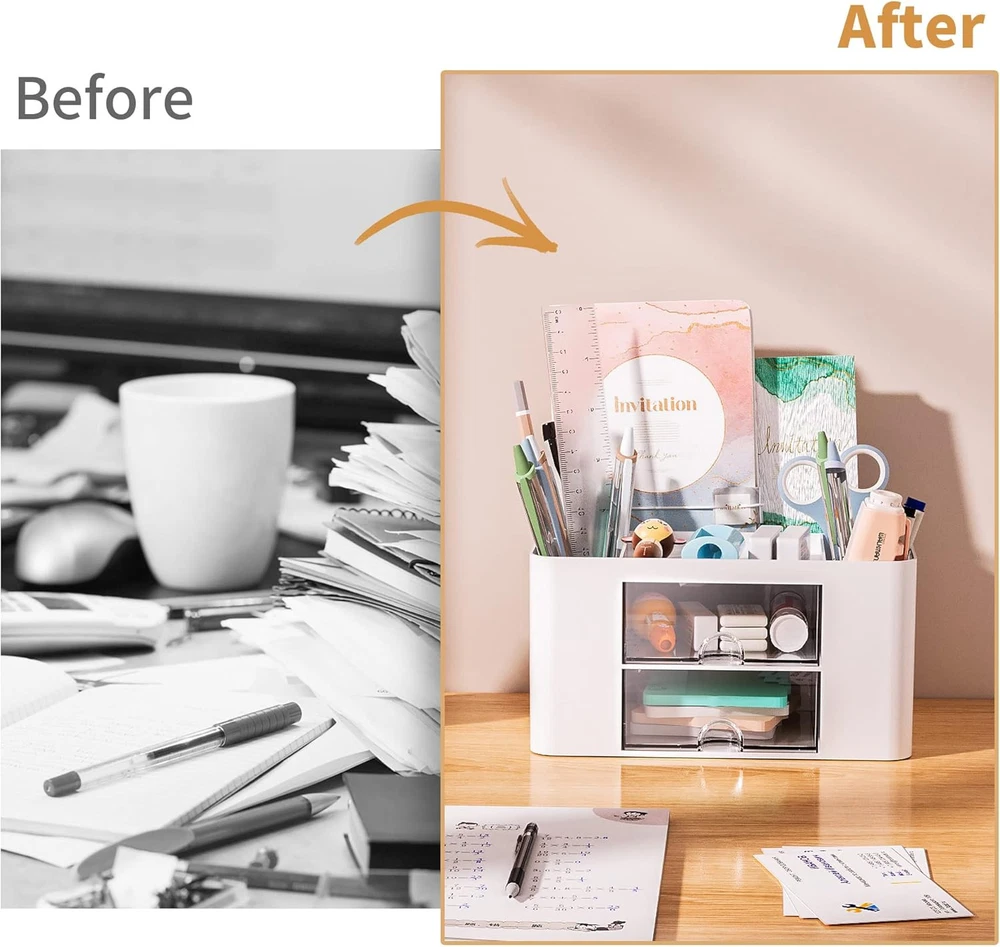 Marbrasse Pen Organizer with 2 Drawer, Multi-Functional Pencil Holder White Description Features: 【Enough Capacity】Set of 3 compartments pen holder, 1 top tray, 1 notebook holder, and 2 drawers which have enough storage to allow for office supplies organization. Large capacity, multifunction help you arrange the desk accessories and stationaries clean and tidy.The best and safest storage option for you. Perfect Size:7.6*5.5* 3.9inch 【Practical Desk Caddy】This Ideal desktop storage box is practical for organizing and categorizing small office essentials like iPads, pencils, markers, scissors, sticky notes, notebooks, paper clips, and more, enabling you to maximize your workspace and achieve a more tidy and orderly desk appearance 【Convenient And Multifuction】This Desk Caddy is no installation required not only perfect for storing your desktop stationery and many other desk widgets but also great for storing your makeup brushes, nail polishes, lipsticks, and other small personal items sorted by type. The transparent drawer makes it way easier to find what you need! and You can put any other daily necessities on the organizer, It helps you keep your stuff organized 【Premium Material】This storage drawer organizer is crafted from durable ABS plastic, ensuring its strength and solidity for long-term use. The smooth operation of its drawers allows for easy opening and closing. Additionally, its waterproof design makes it effortless to clean, maintaining its pristine appearance over time 【Best Choice】The all-in-one desk pen organizer be certain to bring our customers more convenience in the office and be popular in our daily life. If you have any questions, please feel free to contact us and we'll help to solve it in 24 hours. You take NO RISK by ordering today Product Details: Specific Uses For Product: Stationery Material: Plastic Special Feature: 2 Drawer Color: White Brand: Marbrasse Finish Type: 表面未经处理 Product Dimensions: 8.2"D x 4.2"W x 6.3"H Shape: Rectangular Package Type: FFP Number of Items: 1 Manufacturer: Marbrasse Item Weight: 10.6 ounces Item model number: Pen Holder 2 Drawer-White Material Type: Plastic Manufacturer Part Number: Pen Holder 2 Drawer-White Specific Uses For Product: Stationery Material: Plastic Special Feature: 2 Drawer Color: White Brand: Marbrasse Finish Type: 表面未经处理 Product Dimensions: 8.2"D x 4.2"W x 6.3"H Shape: Rectangular Package Type: FFP Number of Items: 1 Mounting TypeItem Weight: Tabletop Mount0.66 Pounds Number of CompartmentsUnit Count: 41.0 Count Handling We will ship all orders within 3 business day of payment. Delivery We take pride in offering fast and reliable delivery for your orders! We are committed to getting your products to you as quickly as possible. Generally, we would like to inform you that all orders will be delivered to you within 1-3 business days after processing.However, in some cases, delivery times may vary depending on the buyer's location. Especially in remote or rural areas, the expected delivery time may be extended. In such situations, we do our best to ensure that your order reaches you as quickly as possible.If there are any delays, we will be happy to contact you to explain the situation. Our goal is to enhance your satisfaction with our fast delivery times. We work diligently to ensure that your order arrives safely.Trust us and enjoy our speedy delivery! Return Policy All items qualify for returns within 30 days of receipt. Buyer is responsible for return shipping on any item that is not damaged. Feedback We take our reputation seriously, we buy and sell online, so we understand the value of trust. If you are unsatisfied with your order, please contact us and we will work with you to resolve it to your satisfaction.