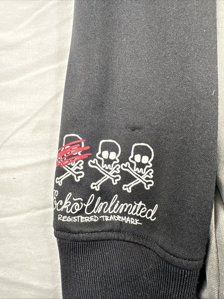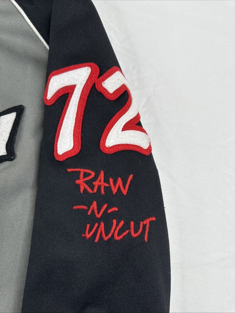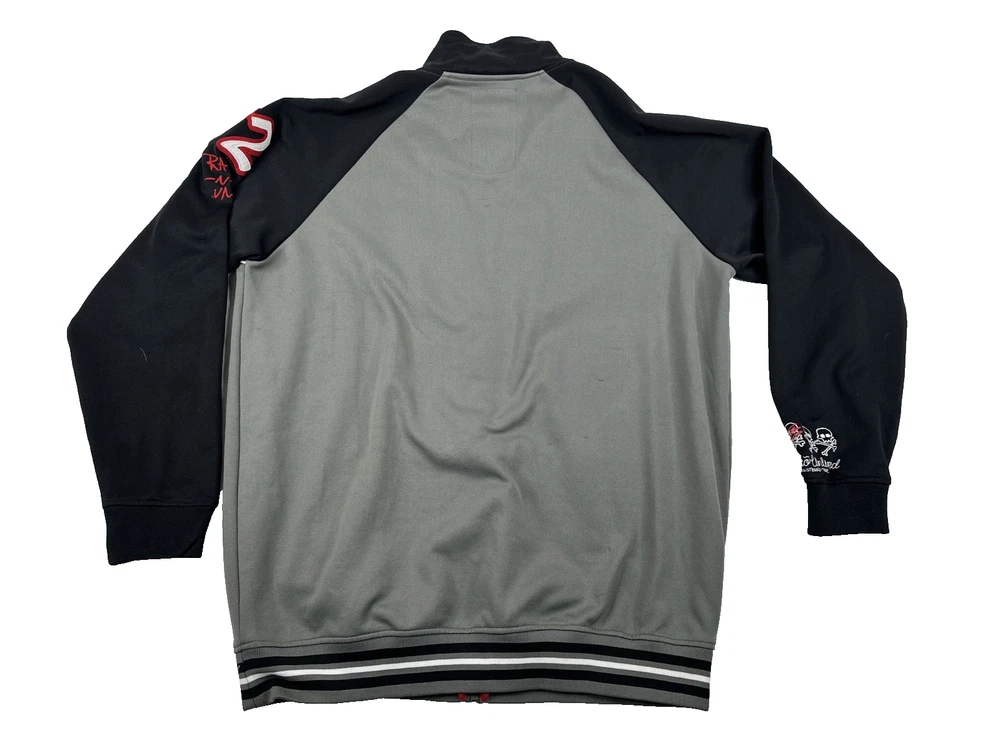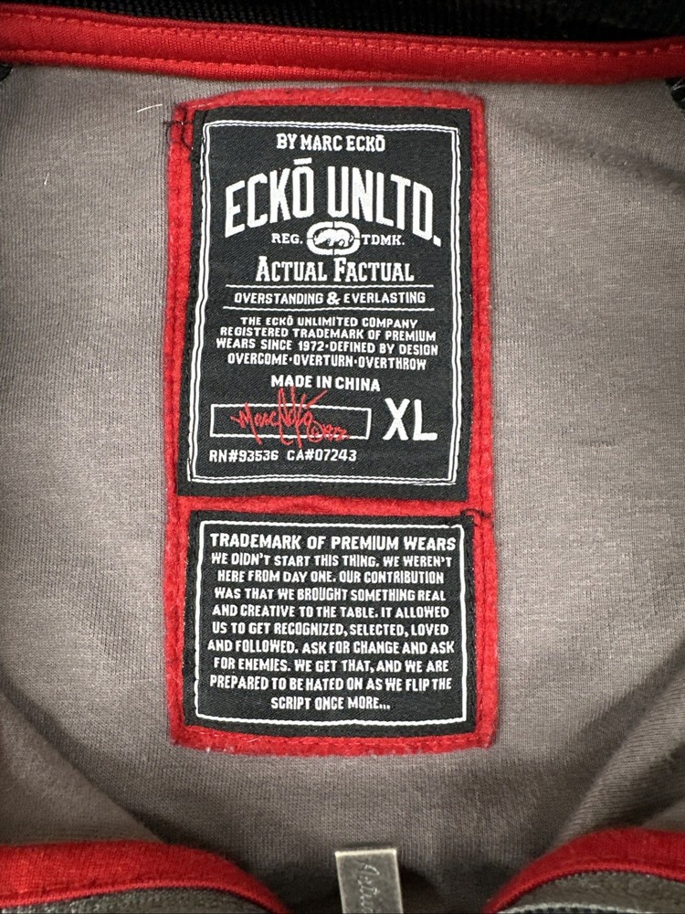 The Marc Ecko Unltd. Vintage Y2K Raw-N-Uncut 72 Full Zip Jacket in men's size XL is a stylish and edgy bomber jacket made from a cotton blend outer shell with a polyester lining. Featuring a solid black & gray color scheme, this casual jacket has a vintage appeal with logo accents. The full zip closure and regular fit make it perfect for winter, fall, and spring seasons, ideal for walking and everyday wear. Easy to care for with machine washable instructions, this jacket combines classic style with modern functionality for a versatile and on-trend addition to any wardrobe.