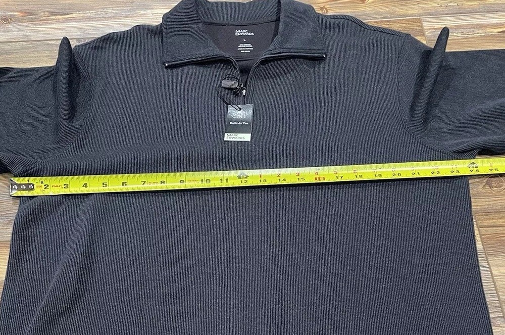 Elevate your wardrobe with this stylish Marc Edwards sweater, perfect for any fashion-forward man. The sweater features a solid pattern with a tight-knit fabric type, long sleeves, and a mock neck. It comes in a size L and is made of a comfortable blend of polyester and cotton, which makes it machine washable for easy care. The black and dark gray color combination gives it a sleek and modern look, while the ribbed accents add a touch of texture. The sweater is designed with a regular fit and a 1/4 zip feature for added style and convenience. This pullover is perfect for any occasion, and it's a must-have addition to any man's wardrobe. New with tags! Marc Edwards 1/4 Zip Sweater 2-in-1 Built in Tee Long Sleeve Men’s Size Large Black and Dark Gray Flat measurements Underarm to underarm 26 inches Length from shoulder down 29 inches