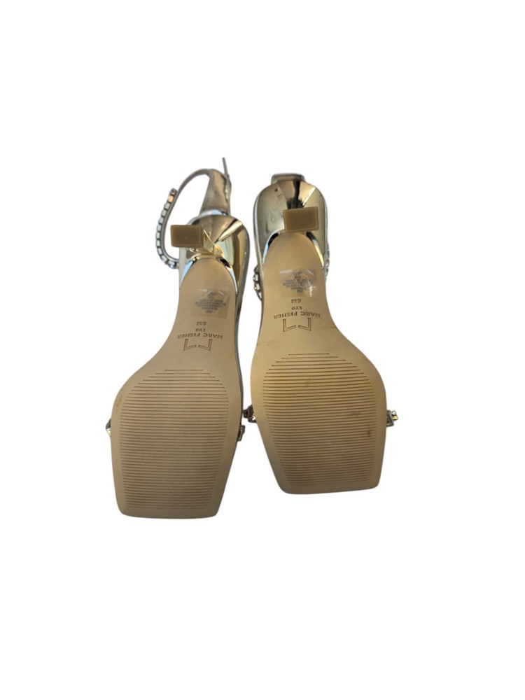 Department: Women Pattern: Jeweled US Shoe Size: 6 Type: Sandal Color: Gold Theme: Metal Closure: Buckle Heel Height: Ultra High (4 in & Higher) Brand: Marc Fisher Model: Marc Fisher Karima Features: Ankle Strap Upper Material: Synthetic Style: Ankle Sandals Heels