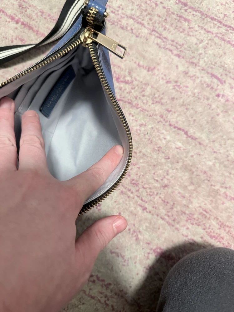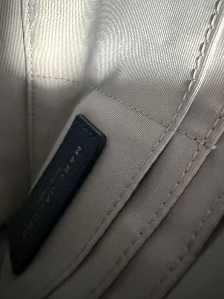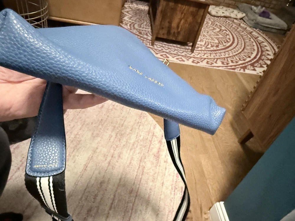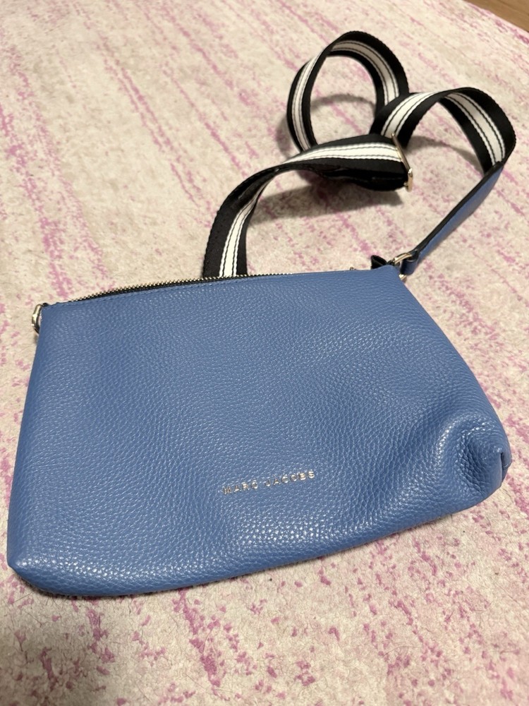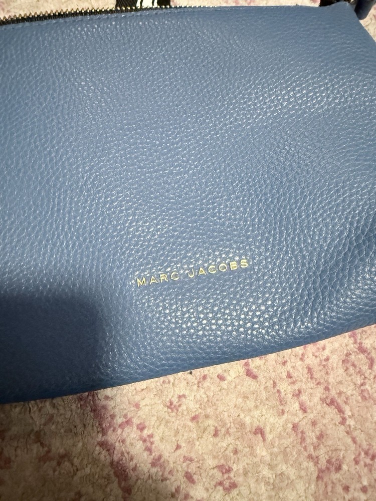 The Marc Jacobs The Cosmo Leather Crossbody Bag in Blue Heaven is a stylish and trendy handbag designed for women. Made of high-quality leather, this crossbody bag features a beautiful blue exterior color with a floral theme, adding a touch of feminine charm to any outfit. The versatile design of this bag makes it suitable for everyday use, while the brand's reputation for quality ensures it will last for years to come. Perfect for those looking for a fashionable and practical accessory to elevate their look. The adjustable woven strap is 22 inches. The purse itself is 6.5” L x 9.5” W x 1.5” D. Zip top closure. Features card slots. Leather exterior. Though this was purchased second hand, it does not appear to have ever been used. There are no visible signs of wear on the outside or inside. See photos.