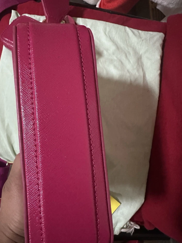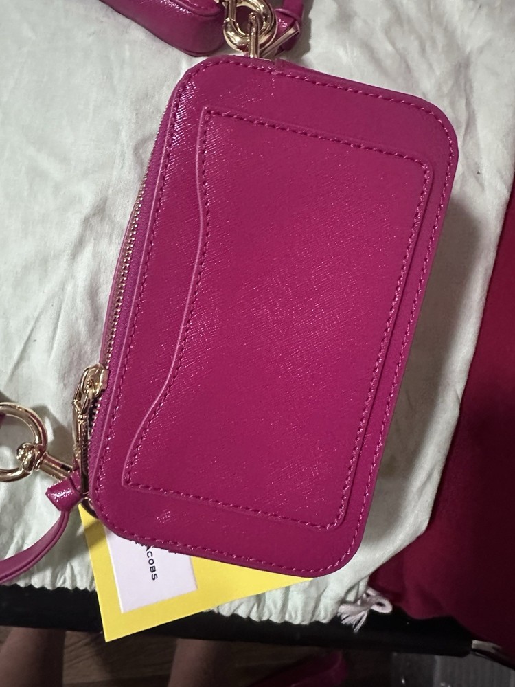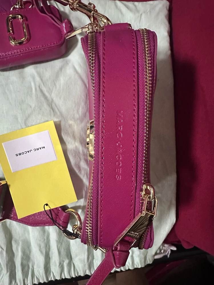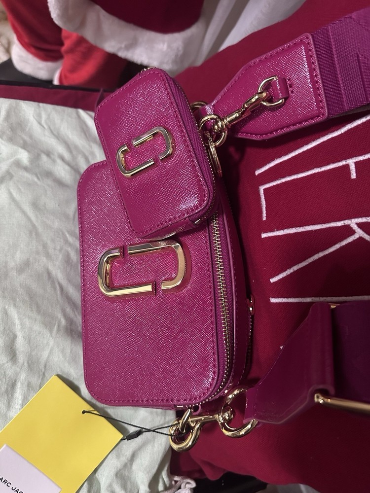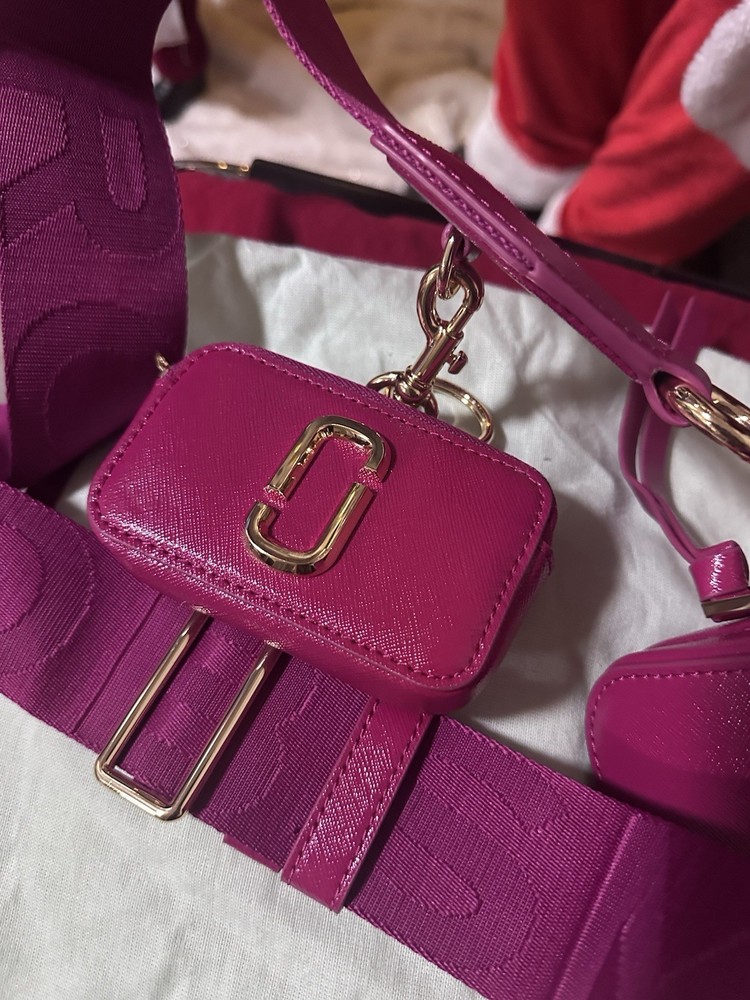 This is a Marc Jacobs The Snapshot DTM camera bag in saffiano leather with a tonal logo webbing strap.