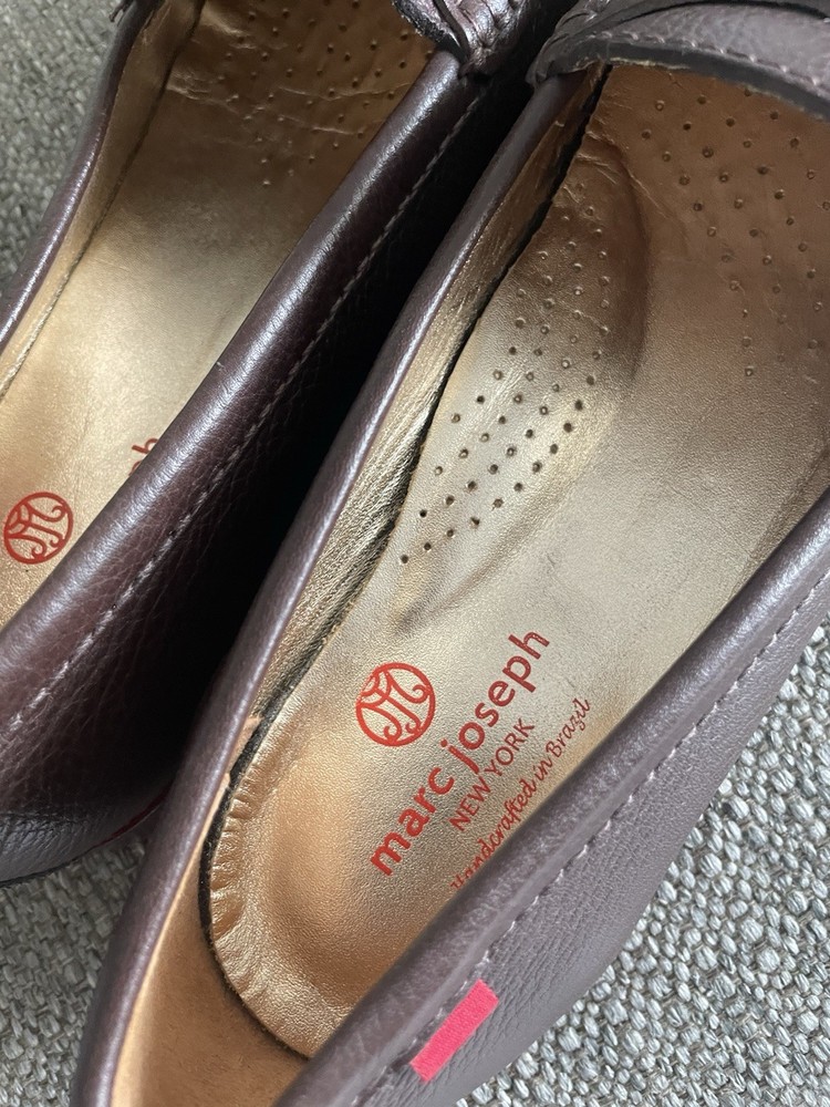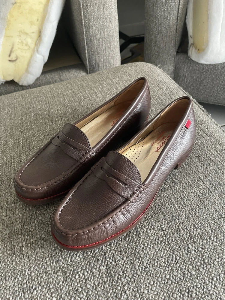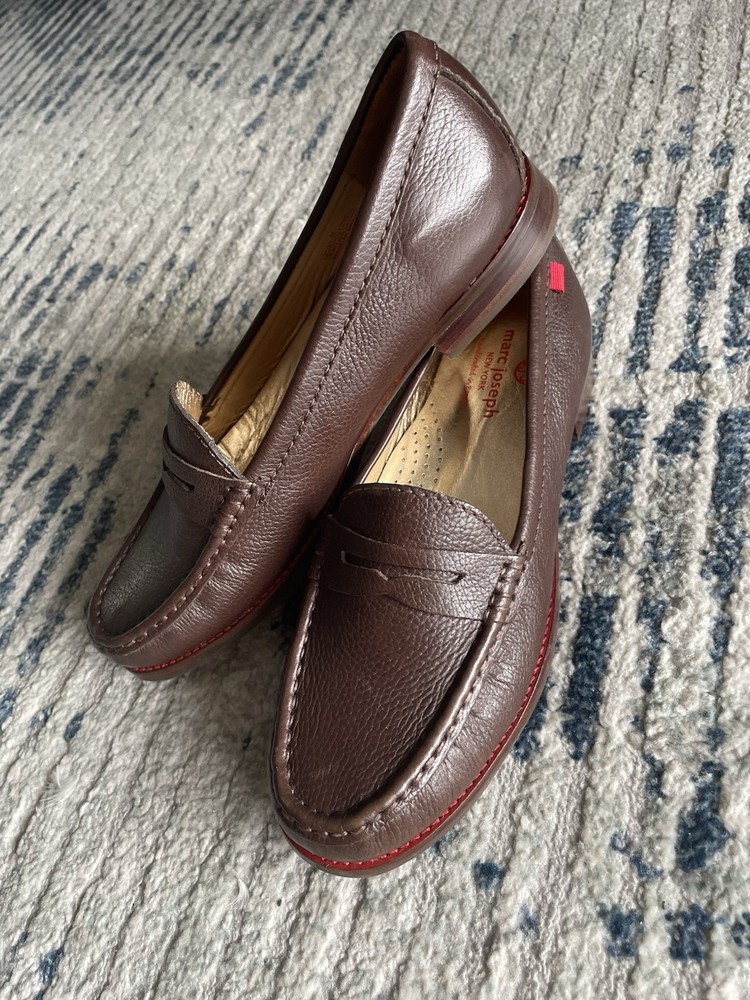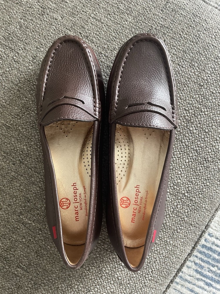 The product is a pair of Marc Joseph New York women's loafers in size 8. These slip-on loafers are in a solid brown color, made of leather with a rubber outsole. They are designed for casual occasions during the summer, fall, and spring seasons. The loafers feature a standard shoe width and are part of the Marc Joseph New York brand, known for their quality and style. Perfect for women looking for a comfortable and stylish flat shoe option.