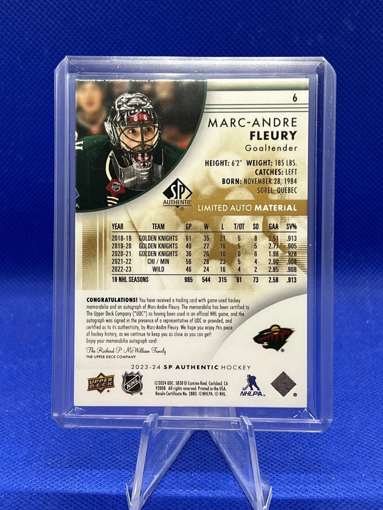2023-24 SP Authentic Marc-Andre Fleury Minnesota Wild Hockey Card All items are securely packaged professionally to ensure that the items arrive in the same condition as advertised. Every order will be processed promptly and include shipping information. 100% customer satisfaction is guaranteed. Most cards are scanned in a penny sleeve and top loader. Some scans may showcase debris that is not on the actual item. Important Notes for Buyers: No Off-eBay Transactions: All sales will be conducted strictly through eBay. Any requests to sell outside the platform will be ignored. No Lowball Offers: Please do not waste time with unreasonable offers. The card is priced based on its market value and rarity. Price Comparisons: We are not interested in how much you or someone else paid for a similar card recently. Serious Inquiries Only: Only genuine questions or offers from serious buyers will be entertained. We value both your time and ours and simply do not have the resources to engage in unnecessary back-and-forth. Let's keep things efficient and straightforward for everyone involved. Thank you for your understanding!