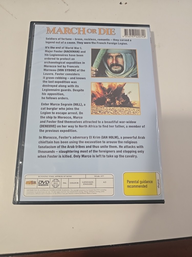 "March or Die (DVD, 1977) starring Terence Hill and Gene Hackman is a thrilling action & adventure film set in all regions. With a runtime of 105 minutes, this classic movie features a stellar cast including Catherine Deneuve, Max von Sydow, and Ian Holm. Directed by Dick Richards, this Mra Entertainment production is a must-have for fans of the genre. Switch on your DVD player and immerse yourself in this gripping tale of courage and survival."