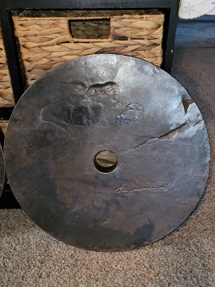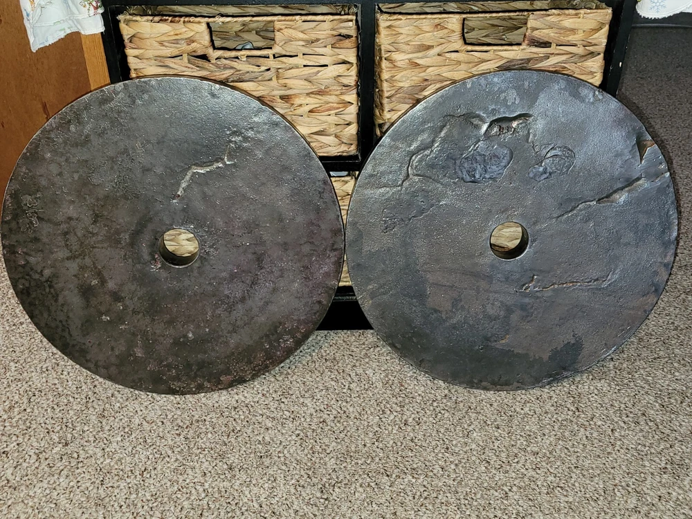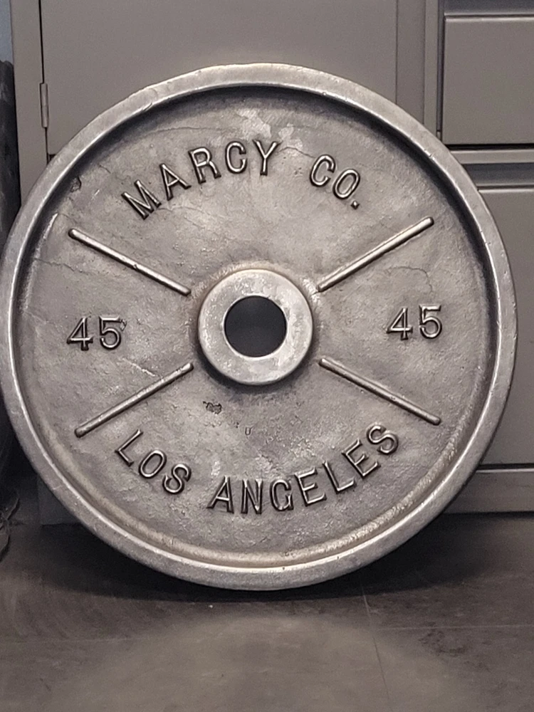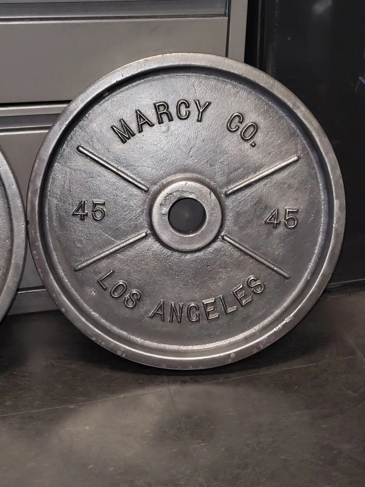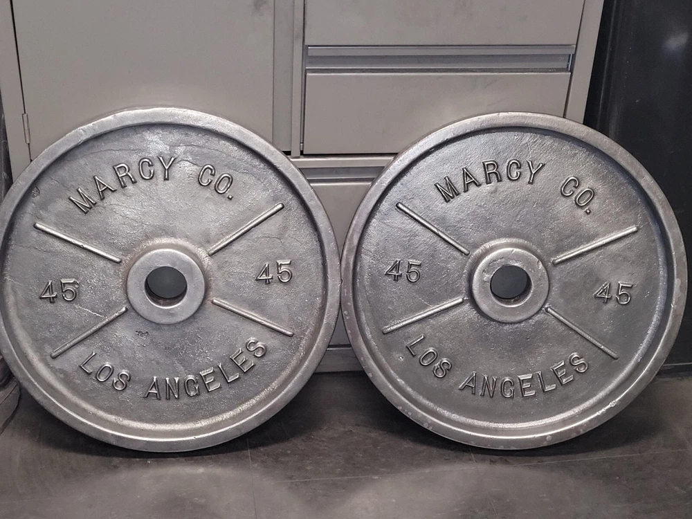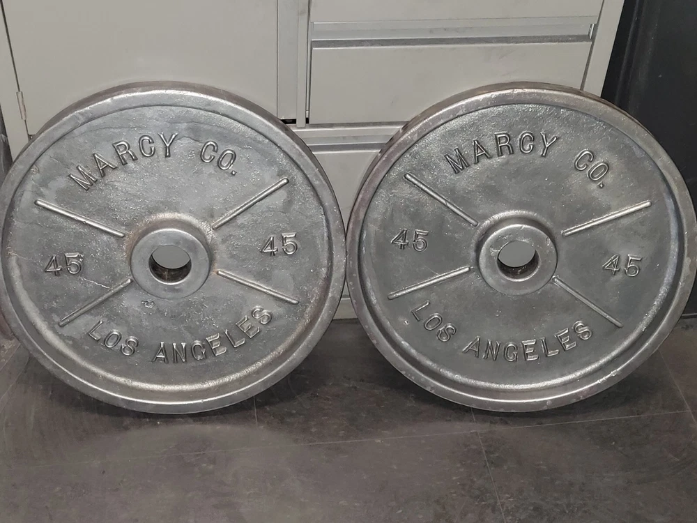 Deep dish Marcys, Vintage Weight plates. Well used which gives them more character.