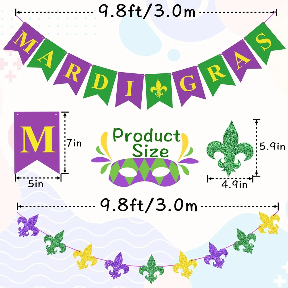 Store New Arrivals Add to Favorite View Feedback Contact Fast deliveries to the customer's home Quality customer service John Make the customers happy! Mardi Gras Banner Garland Fleur De Lis Hanging Bunting, Mardi Gras Decorations Carnival Masquerade Party Supplies, Fat Tuesday Photo Backdrop Home Outdoor Decor Description Add that perfect touch to your party with our Mardi Gras Banner set, stylish and eye-catching, comes pre-strung and distance adjustable that you can space them to the perfect site you like. Package includes Mardi Gras party decorations in two separate strands, 1pcs "MARDI GRAS" banner and 1pcs fleur de lis garland, features classic Mardi Gras themed colors and patterns can meet your different decorative needs, making your party more special and attractive. The Mardi Gras decor is perfect for Mardi Gras themed party, birthday, wedding, Carnival party, Masquerade party, New Orleans celebration party supplies, etc., it will give your home or business a festive feel, easy to bring a New Orleans touch to the party! The Mardi Gras banner is made of thick cardstock, lightweight and sturdy enough to use many times, the swallowtail flag is 5 x 7 inches, glitter fleur-de-lis pattern is 5.9 inch in length, large and colorful enough to catch people's attention. They can be hung from ceilings, branches, doors, windows, fireplaces, archways, and many other places, also as great backdrop to take interesting photos and leave unforgetable memories for you and your friends. Product Description Item model number MAR068 Color Gold Green Purple Product Dimensions 7"L x 5"W Material Paper Country of Origin China Fabric Type Paper Item Weight 2.89 ounces Theme Carnival, Masquerade Specific Uses For Product Outdoor, Indoor Recommended Uses For Product Party Occasion Baby Shower, Mardi Gras, Anniversary, Birthday Special Feature Lightweight, Foldable ABOUT US We offer the best prices around on high quality products. Our E-store includes media such as books, movies, music and games while offering electronics, toys, sporting apparel, clothing, tools, general home, garden items and more. SHIPPING We are always working hard to ensure your package arrives as soon as possible. Please understand that some factors like weather, high postal traffic, and the performance of shipping companies are outside of our control. We offer free shipping to the lower 48 states and ship within 2 business days of payment, usually sooner. We do not accept P.O. Boxes. Please provide a physical address. For shipping outside of the continental USA, we only use eBay's Global Shipping Program. The item is shipped to KY and then sent to the rest of the world. International customers are responsible for all duties and taxes. Continue to 'check out' to calculate costs for shipping the item to your country. Messages regarding eBay's Global Shipping Program MUST be directed at eBay EXCLUSIVELY. RETURNS We offer a 30-Day Return Policy on items in which you are not completely satisfied with. You have the option of a full-refund or an exchange of the item. No returns are available on items shipped outside of the USA PAYMENT We accept PayPal. CONTACT US This page content is yet to come Please ad us to your favorite seller and visit again later Thank You CUSTOMER SATISFACTION We try our very best to make sure every customer is completely satisfied. If there's a problem, message us! We're happy to help. WE ACCEPT