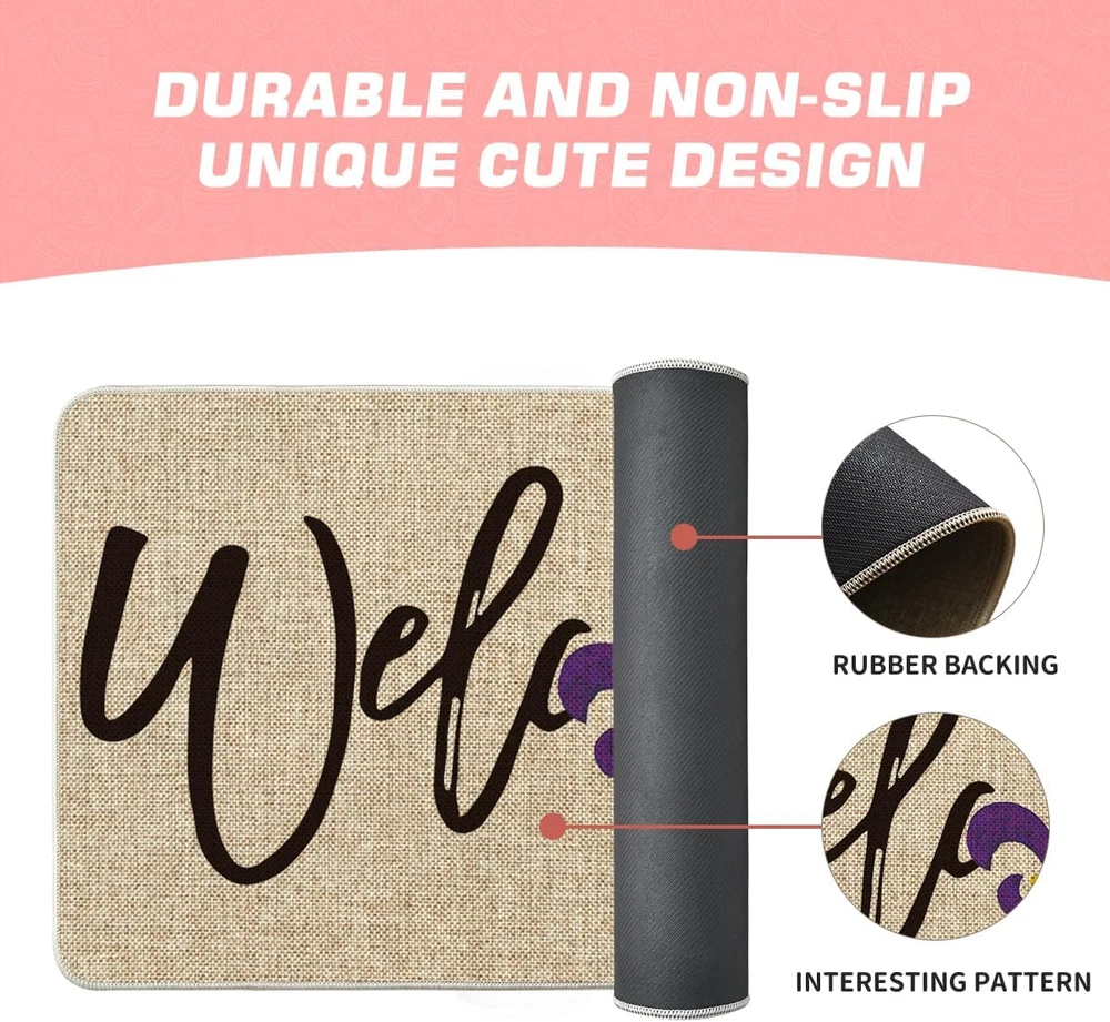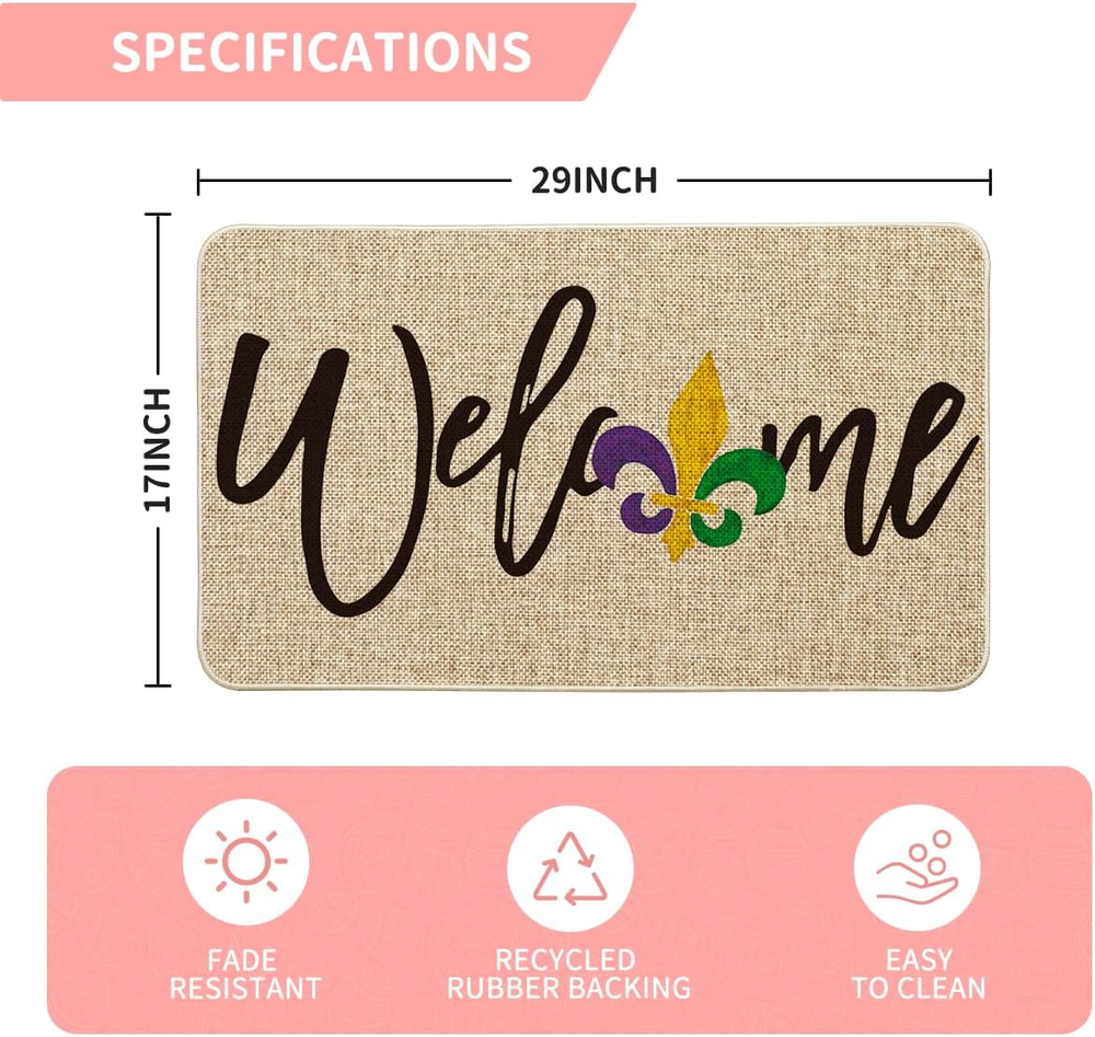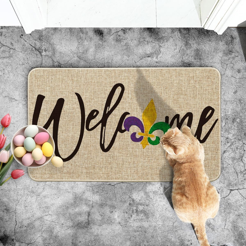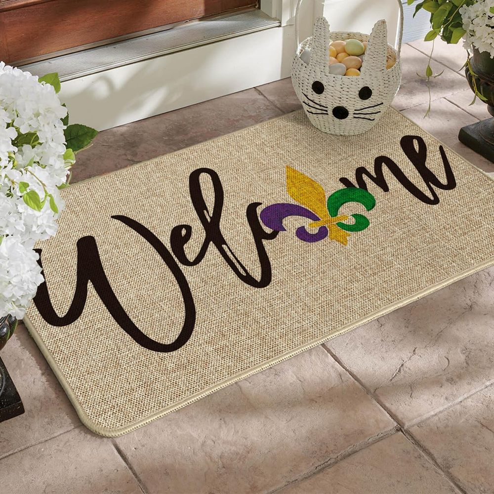 This Mardi Gras doormat is a festive and fun way to welcome guests! The colorful irises and carnival design add a cheerful pop to any entryway, and the low-profile rug stays firmly in place with its non-slip backing. Perfect for indoor or outdoor use, it’s durable, easy to clean, and just the right size. Love how it brightens up my porch—great quality and fast shipping too!