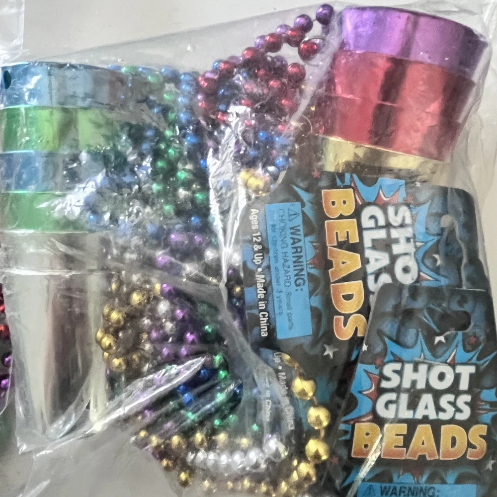 Mardi Gras Shot Glass Beads New Pack Of 12 With 1 Pound Bag Of Used Asst. Beads