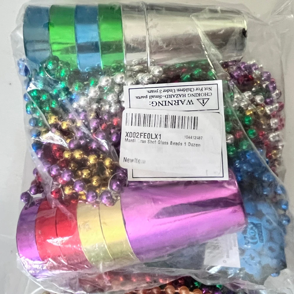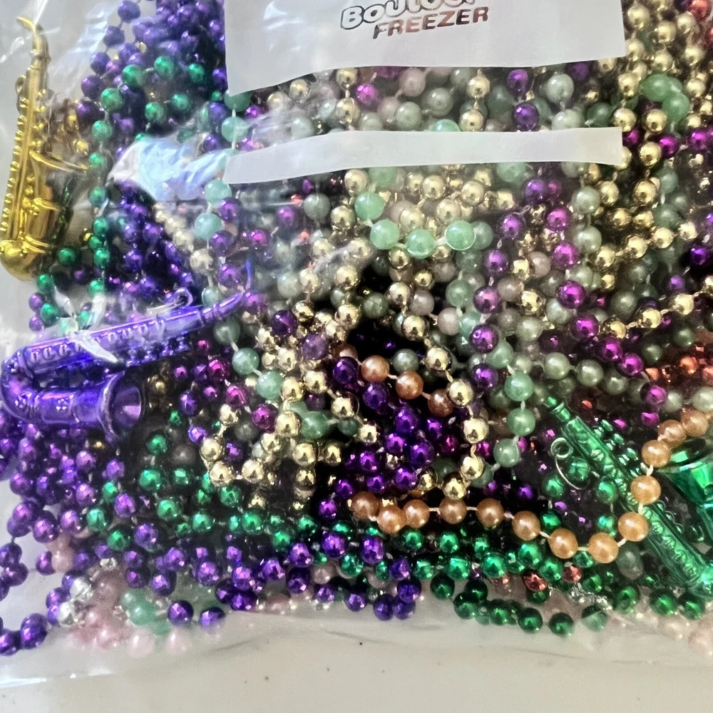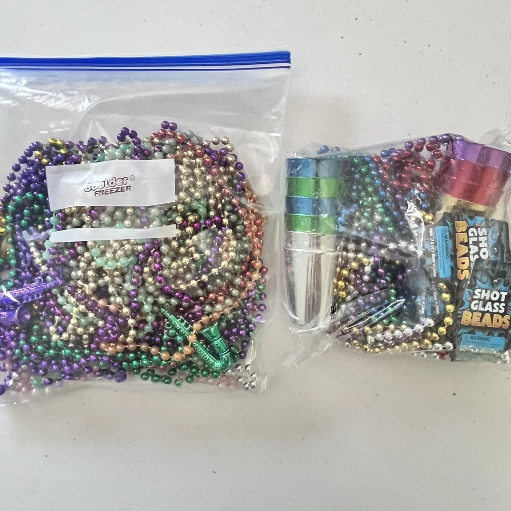 Brand new unopened bag of 12 shot glass Mardi Gras beads, and 1 pound bag of assorted , multicolored Mardi Gras beads. 3 of the pound bag have a saxophone attached, the others are plain beads. See pictures for details. I do sometimes use recycled packing materials.