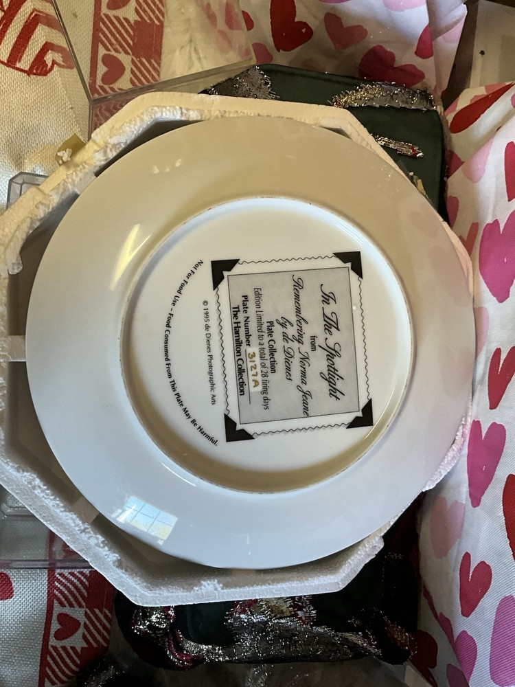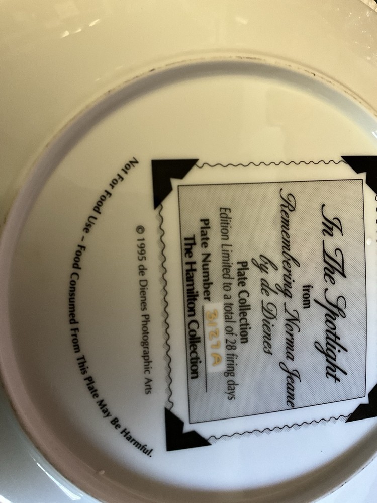 Marilyn Monroe plate , IN THE SPOT LIGHT, REMEMBERING NORMA JEANNE $8 Hi, thank you for looking. I sell beanie babies I own beanie baby heaven. I get some stuff like this from time to time. This is absolutely mint condition. I just wanted to go to a happy home. Thank you for looking..