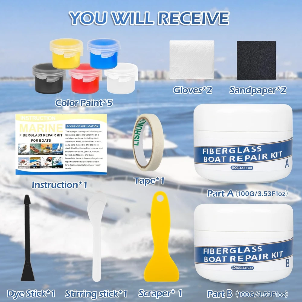 Marine Fiberglass Repair Kit 【Good Helper for Fiberglass Repair】This gel coat repair kit for boats is perfect for fixing chips, cracks, pits, gouges, scratches, and holes on a variety of watercraft, including jet skis, canoes, kayaks, sailboats, speedboats, yachts, dinghies, surfboards, and decks and make the boat look as good as new. With it, small problems encountered at sea can be easily solved without worrying about affecting sailing. 【Color Macth】The fiberglass boat repair kit includes translucent base colors and five tints: white, blue, yellow, Red and Black. By Adding appropriate amount of pigment, make the marine epoxy matches the boat's color well, resulting in a very natural repair that is hard to notice. 【Permanent Repair & Long Lasting】Our gelcoat for boats offers super-strong adhesion, UV-resistant and waterproof (Minimum temperature:-60°C, Maximum temperature:200°C), ensuring permenant repairs. In cool, humid marine applications, this gives ultra long working times and slow cure allowing to self level and gloss-up. 【Versatile to Use】This surfboard repair kit can repair parts above the waterline on a variety of materials, including steel, aluminum alloy, wood, carbon fiber, plastic, composite materials, and stainless steel. Our marine fiberglass repair kit is the ideal choice for diverse marine repair needs. 【Easy to Use】 1. Clean the repair area and cover surrounding areas with the sticker, exposing only the damaged spot. 2. Mix Part A and Part B in a 1:1 ratio with a wood stick. 3. Gradually add dye with a toothpick until the colors match. 4. Apply the boat paint to the damaged area, smooth it with the yellow scraper, and remove the tape. 5. Wait over 24 hours for the marine paint to cure. 6. Sand the repaired area with sandpaper until smooth.
