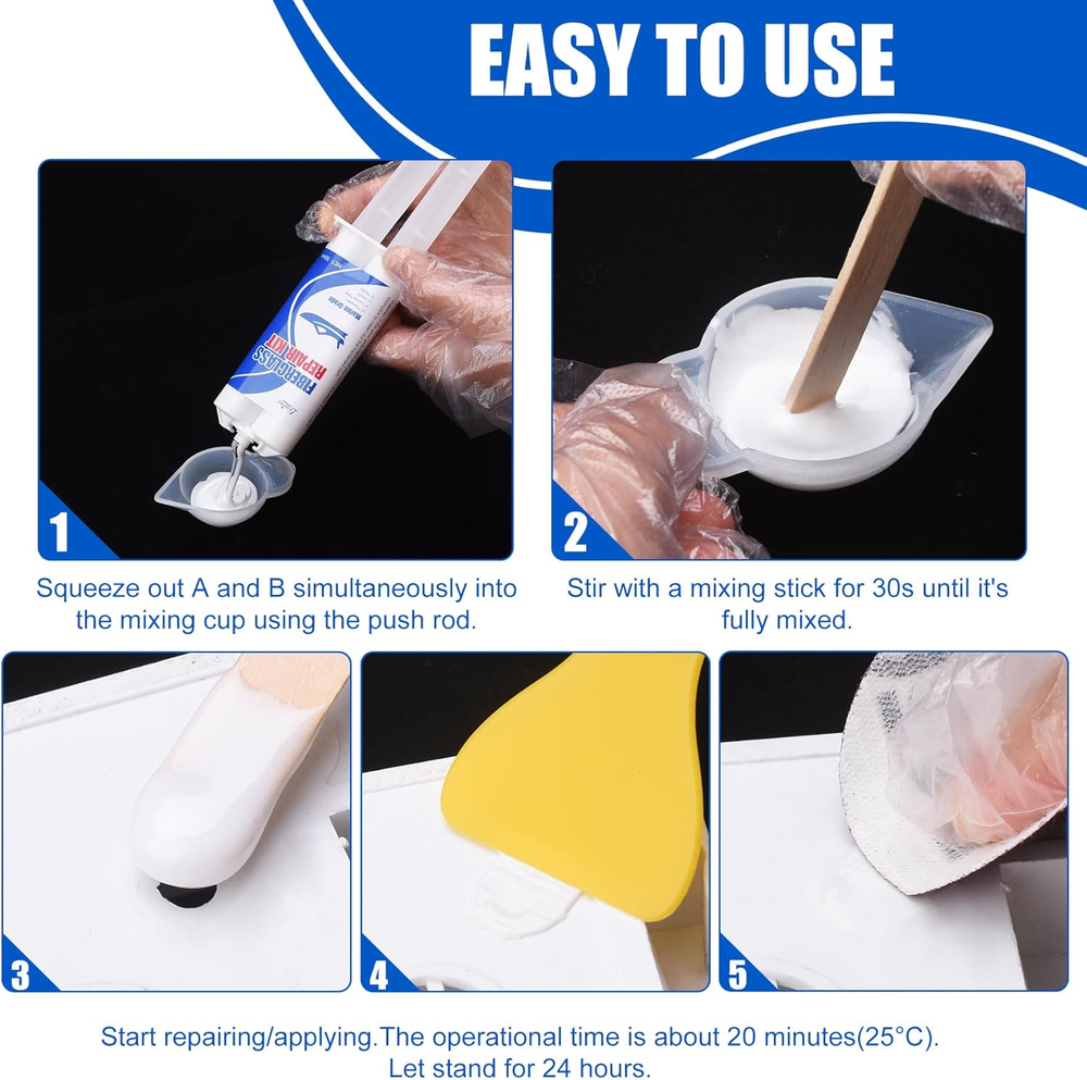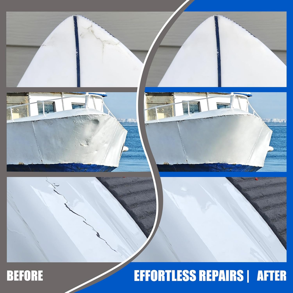 SPECIALIZED FIBERGRASS KIT - Our marine fiberglass repair kit has mega adhesion to effectively repair fiberglass boat damage on horizontal and vertical surfaces (Above The Waterline), perfectly repairing scratches, cracks and holes on the boat. Excellent UV resistance and waterproof protection, specially designed to cope with exposure to sunlight and humid environments, making it suitable for various types of boat repair tasks such as motorboats, surfing boats, kayaks, yachts, sailboats, canoes. VARIETY OF APPLICATIONS - The gelcoat repair kit has good compatibility with surface damage repair of fiberglass, carbon fiber, acrylic, plastic, porcelain, stainless steel, stone, aluminum and other materials. Not even for boat, if you encounter the above materials you need to repair in your life, use this product to started doing a bunch of small repairs around the house immediately. DURABLE AND LONG-LASTING QUALITY - We use two-component fiberglass filler for detachable open packaging, ensuring the activity of the product during storage and its reusability. With outstanding mega adhesion, it can ensure the perfect fit between the adhesive and the repaired wound, and maintain a steel like hardness and toughness for a long time. It is a perfect marine fiber glass simple repair kit. SIMPLY TO USE - The marine fiberglass repair kit equipped with complete accessories, we use the push rod to squeeze out A and B simultaneously into the silicone cup. After 30s mixing, start repairing and applying. The operational time is about 20 minutes (25℃). Fully curing time is 24 hours. When it solidifies, its hardness is as hard as steel. So we equipped sandpaper to polish the surface for better fusion effect. ECONOMICAL AND PRACTICAL - The same expenditure can achieve greater capacity without sacrificing quality. If you are not satisfied with your purchase or if it arrives damaged, don't hesitate to reach out to us. Click 'Add to Cart' now and enjoy the journey of perfect repair experience. Product Description