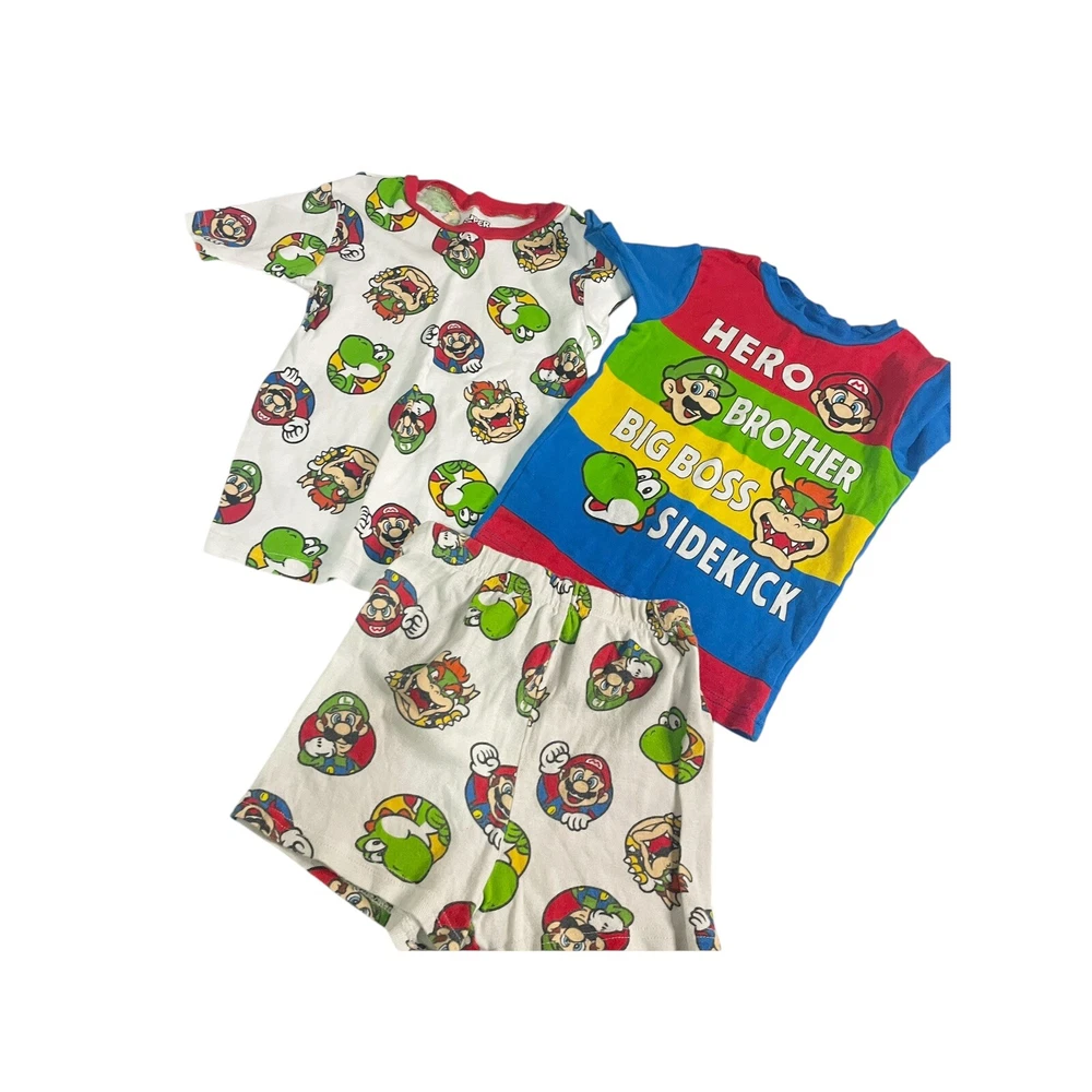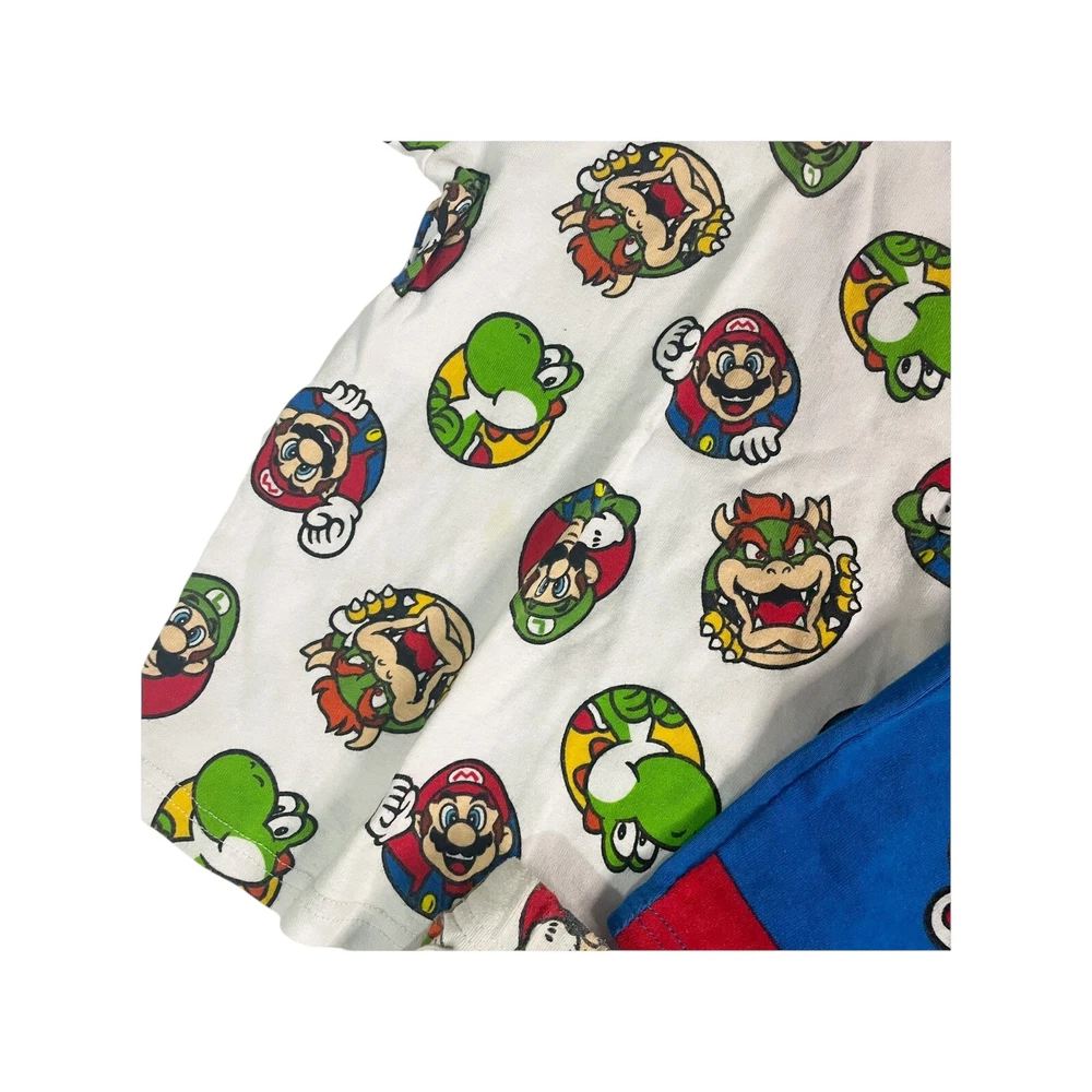 This is a Mario-themed pajama set for boys, size 8. It includes two shirts and shorts in blue and white colors. Made of stretch cotton material, the set is comfortable for sleepwear. The design features a colorful theme and is suitable for young boys who are fans of the Mario character. in good. condition. spot on the white shirt All Measurements Are Approximate Please email us with any questions! ** LIKE THE ITEM BUT NOT THE PRICE, REASONABLE OFFERS ACCEPTED