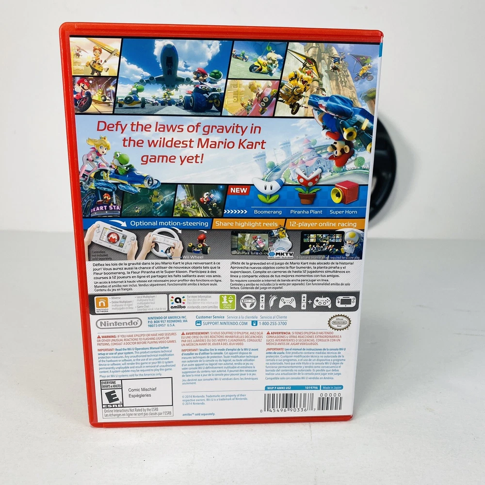 Genre: Racing Platform: Nintendo Wii U Game Name: Mario Kart 8 Publisher: Nintendo Sub-Genre: Car Racing Release Year: 2014 Rating: E-Everyone Video Game Series: Mario Kart Series Country/Region of Manufacture: Japan