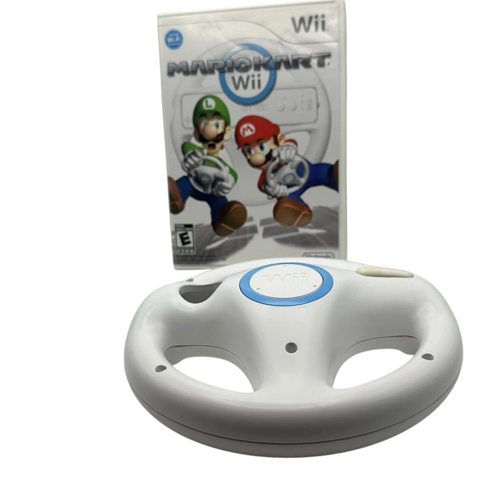 Mario Kart Wii Complete w/ 1 White Nintendo Wii Steering Wheel Bundle Tested