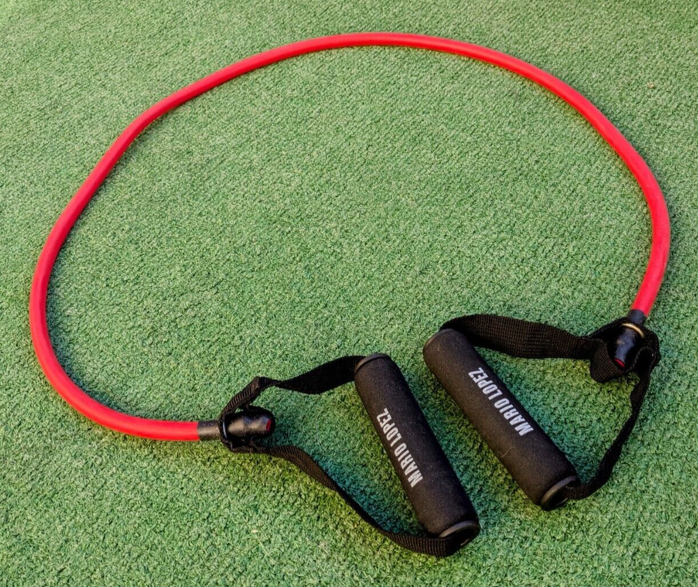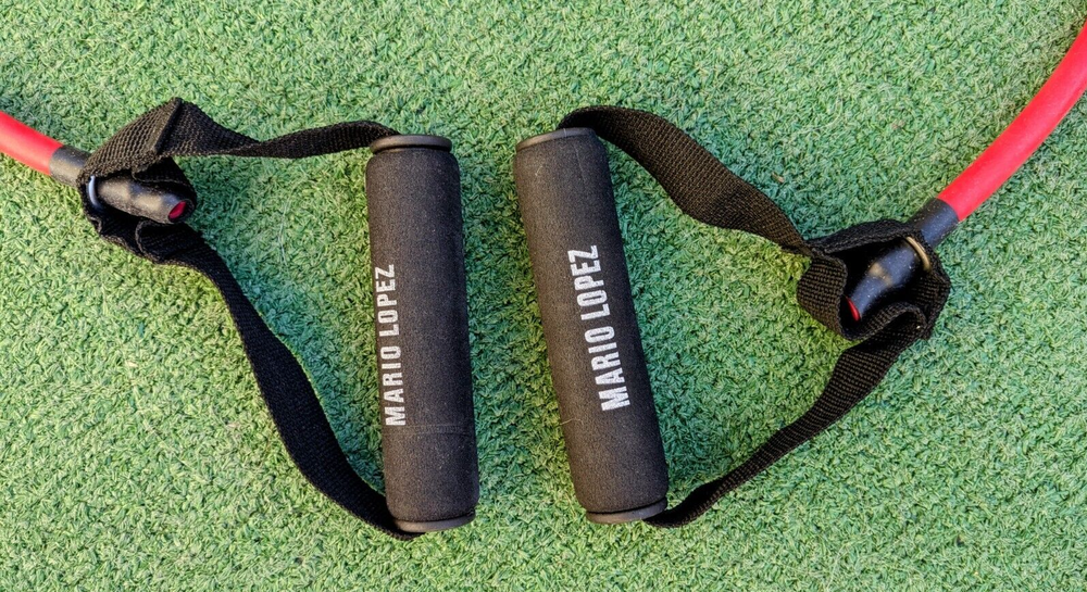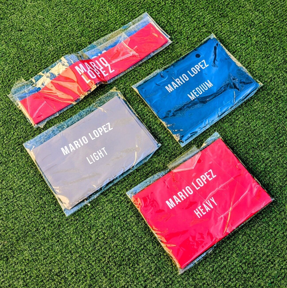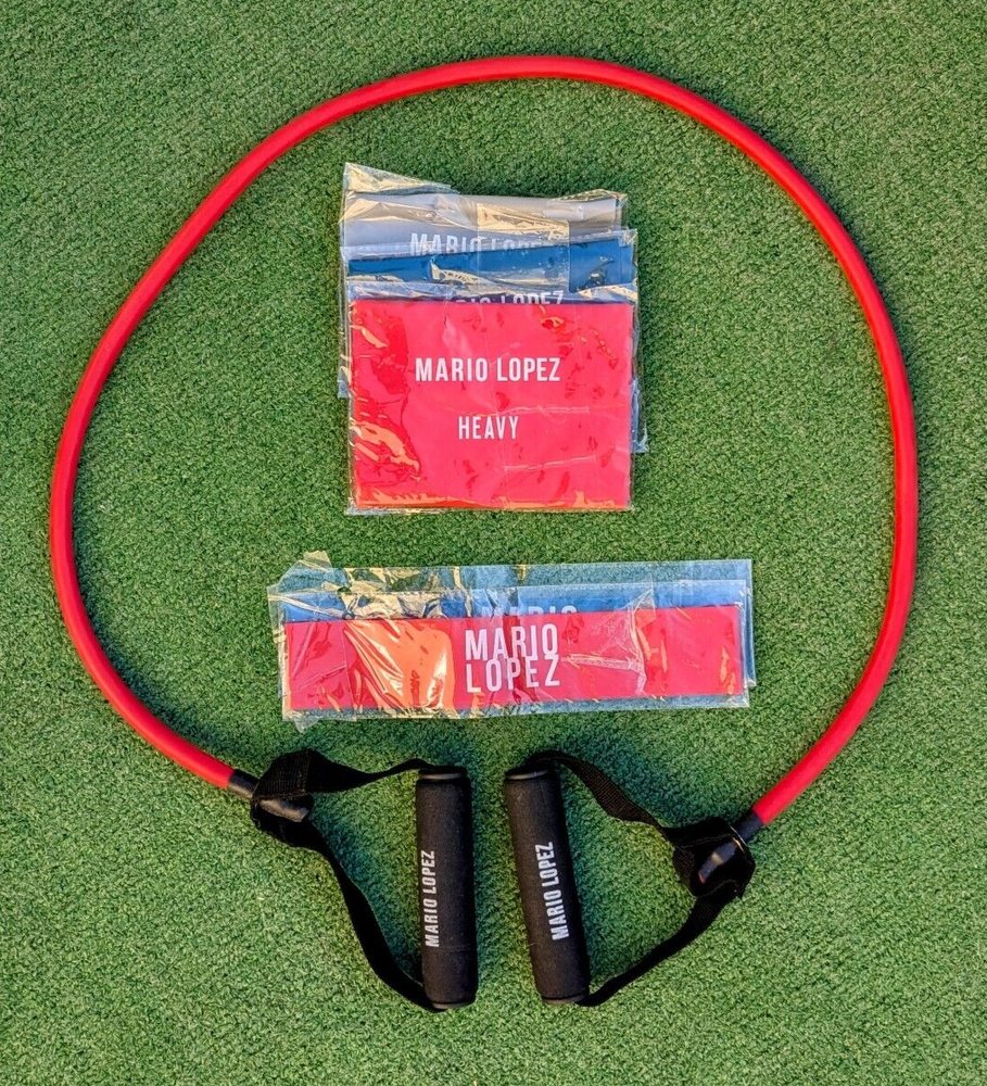 New-Opened-Package, mint condition, and unused but the gray loop is missing. Kit includes: 2 pk loops: Red & Blue 3 pk resistance straps; Gray Light, Blue medium, and Red Heavy Resistance tube ( heavy weight) with easy grip handles All Mario Lopez branded Gain your muscle, get your shape.
