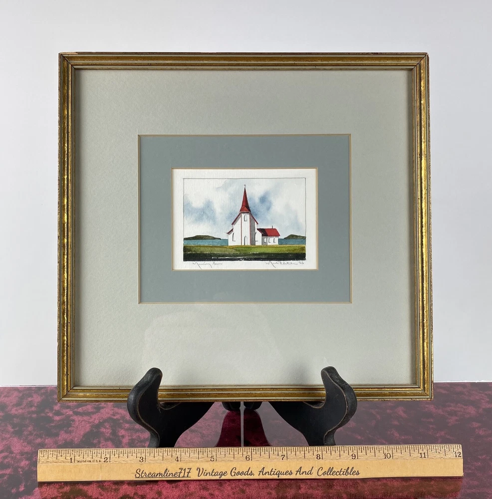 This beautiful miniature watercolor painting titled "Morning Sun" by Mark Fletcher is a one-of-a-kind piece that will add a touch of Americana to any collection. The artist's signature is prominently displayed and the painting is framed, making it a perfect addition to any gallery or display. The painting features a stunning landscape with a barn church absorbing the morning sunlight, all painted with intricate details on high-quality cold pressed paper. This piece is perfect for those who appreciate contemporary art and are looking for a unique piece to add to their collection. Don't miss out on the opportunity to own this beautiful piece of art. Most of our items are second hand and have some shelf wear on them. We do not guarantee mint condition unless otherwise noted. All items in the photos are of the actual product being shipped directly to you (minus display props and measuring devices) If an item is not in the photos, please do not expect it. If you have any questions or concerns, please reach out to us. Our feedback speaks for itself. We do all we can to keep you satisfied with your buying experience from Streamline717