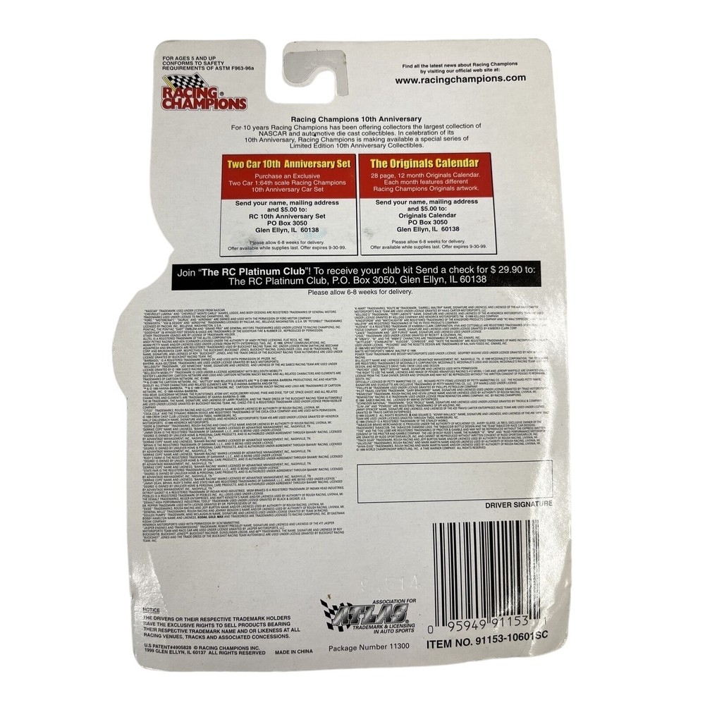 Brand:Racing ChampionsCharacter Family:NascarScale:1:64MPN:91153-10601SCVehicle Type:NASCAR RacecarTheme:MARK MARTIN #6 ZerexFeatures:Limited Edition, Unopened Box, With Stand, Goodyear Red Spoke Racing WheelsRacing Team:Roush RacingSeries:Racing Champions Issue C11 The OriginalsUPC:95949911531Driver:Mark MartinVehicle Year:1999Race series:Winston CupCountry/Region of Manufacture:ChinaColor:ChromeMaterial:Die-cast Metal / PlasticModel:Ford TaurusRecommended Age Range:5+Autographed:Nogtin13:95949911531Vehicle Make:FordAge Level:4-7, 8-11 Years, 12-16 Years, 17 Years & UpOrganization:NASCAR