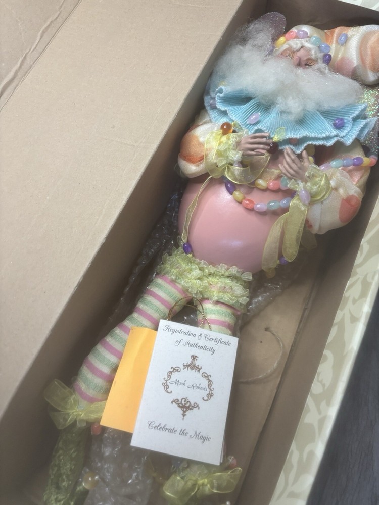 This adorable Jelly Bean Fairy is a true collector's gem! Still in its original box with just a tiny tear, the doll itself is flawless and includes the unfilled registration slip. Rare and beautifully crafted, it’s a must-have for any Mark Robert’s fan. Absolutely love it!