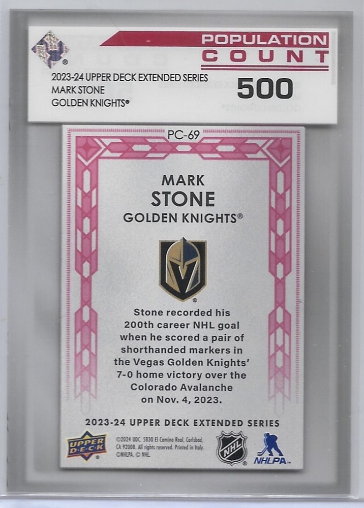 YOU ARE BIDDING ON A MARK STONE 2023-2024 UPPER DECK EXTENDED SERIES POPULATION COUNT 500 ACETATE SHORT PRINT INSERT CARD # PC-69 THE CARD IS IN NEAR MINT TO MINT CONDITION (NEW), AND IS WELL PROTECTED, AND READY TO BE SHIPPED AFTER PAYMENT IS RECEIVED. PAYMENT IS EXPECTED WITHIN 48 HOURS. SHIPPING TO THE UNITED STATES IS 1-3 CARDS FOR 4.99, 0.50 PER CARD AFTER THE FIRST 3 CARDS. INTERNATIONAL SHIPPING TO CANADA IS A FIRST CLASS INTERNATIONAL LETTER, 1-2 REGULAR CARDS FOR 3.00. ANY MORE CARDS THAN THE TWO CARDS IS A PARCEL, WHICH TO CANADA IS 16.99 AND UP. A INTERNATIONAL LETTER TO EUROPE AND ELSEWHERE IS 1-2 REGULAR CARDS FOR 4.00. ANY MORE CARDS THAN THE TWO CARDS IS A PARCEL, WHICH TO EUROPE AND ELSEWHERE IS 18.99 AND UP. ANY QUESTIONS CONTACT ME BEFORE BIDDING! ALWAYS WAIT FOR INVOICE TO BE SENT. (NO BIDDERS IF YOUR FEEDBACK IS LESS THAN 100, OR RECENT NEGATIVE FEEDBACKS, UNLESS YOU CONTACT ME FIRST NO EXCEPTIONS.) ALL SALES ARE FINAL. PLEASE CHECK OUT MY OTHER AUCTIONS AS THEY ARE BEING LISTED. THANK YOU, IF YOU HAVE ANY QUESTIONS PLEASE CONTACT ME. HOCKEYJIM63MAINE-JIM PULLEN. HOME OF THE TWO TIME NCAA HOCKEY CHAMPS MAINE BLACK BEARS
