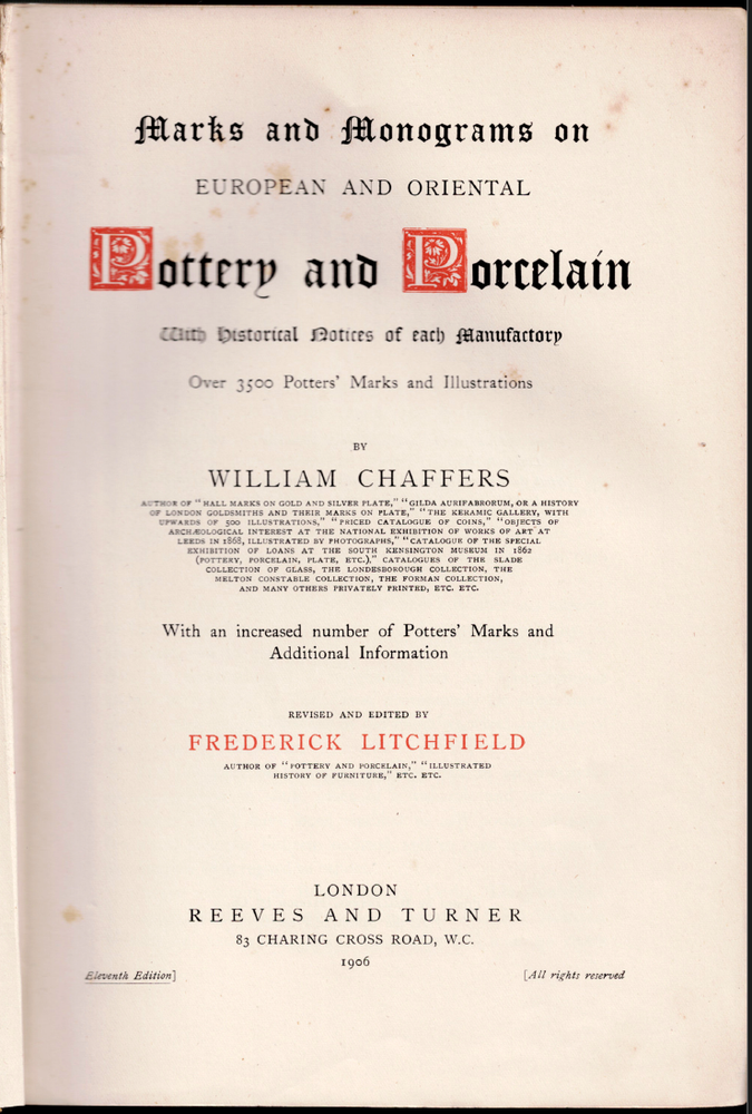 Marks and Monograms on European & Oriental Pottery & Porcelain ; Chaffers 1906 Marks and Monograms on European & Oriental Pottery & Porcelain ; Chaffers 1906 This copy is in ACCEPTABLE condition, it requires re-binding. It makes a good reading or reference copy as is. No dust-jacket. The front board is remains attached only by a small piece of cloth. The front and rear hinges are cracked. The text block is intact and in good order. The pages have light foxing. There is an inscription on the first endpaper. Click here to visit PATRICK ANDREAS QUALITY BOOKS Store Home Page .